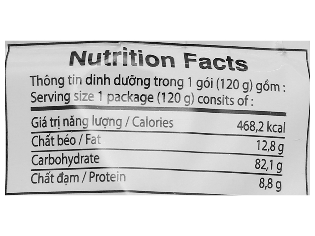 - Mì: Bột lúa mì, chất xử lý bột, dầu cọ, gluten lúa mì, tinh bột khoai tây, muối, canxi, dầu nhũ hoá, chất nhũ hoá,