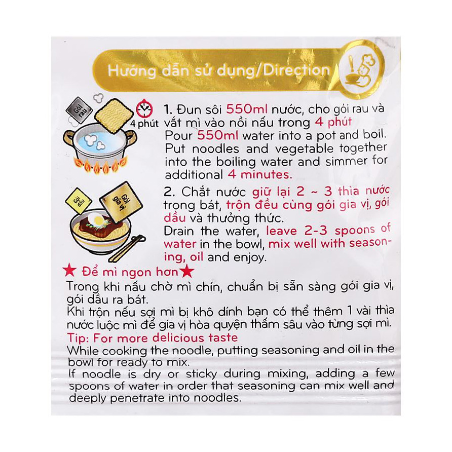Mua tại TiktokMì Koreno Jjajangmen là 1 sự phá cách mới của Paldo Vina. Kết hợp sợi mì mềm dai hòa quyện với gia vị tương đen, một loại gia vị nhập khẩu từ Hàn Quốc và được làm từ các nguyên liệu tươi ngon nhất, tạo nên hương thơm thật quyến rũ khi thưởng thức. Hướng dẫn nấu: Áp dụng cho 1 gói lẻ 115g