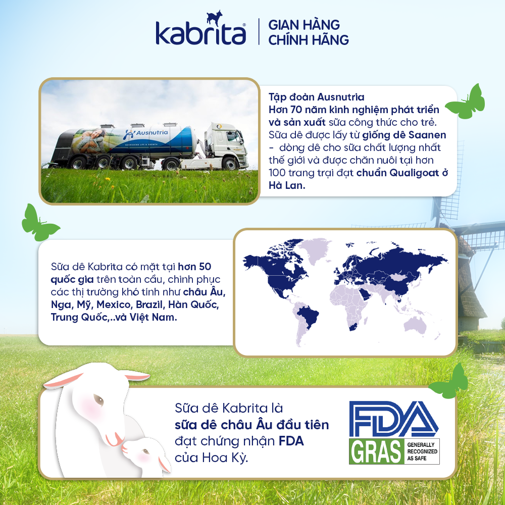 Với hơn 75 năm kinh nghiệm, Kabrita cam kết kiểm soát chặt chẽ từng khâu sản xuất, từ trang trại nuôi dê đến thành phẩm cuối cùng, để mang đến cho bé yêu những sản phẩm dinh dưỡng chất lượng và an toàn nhất.