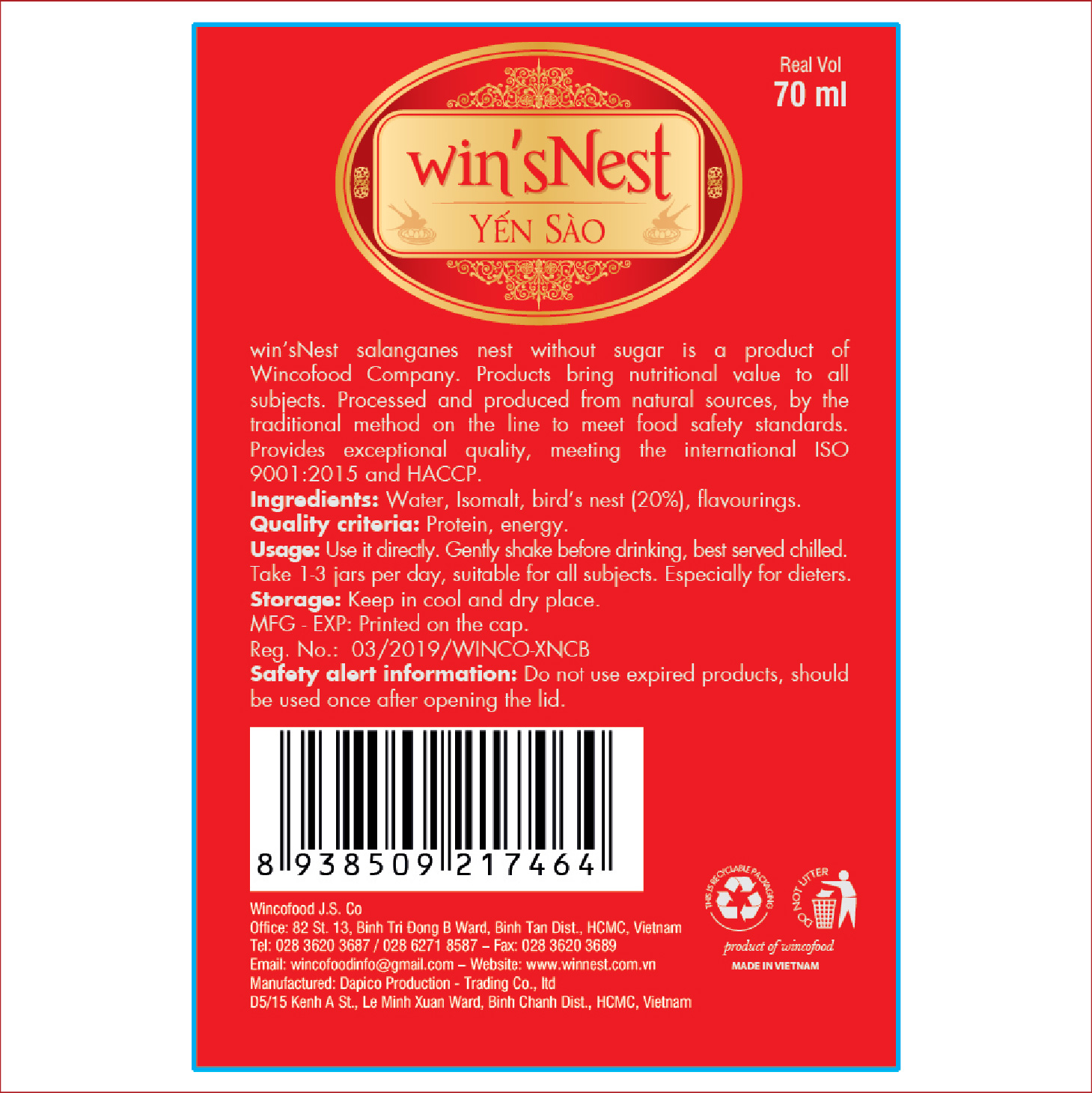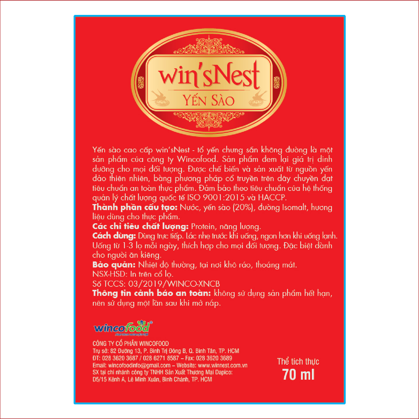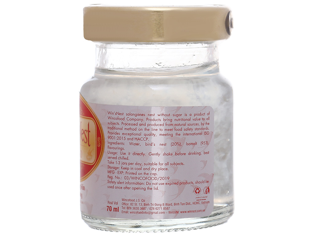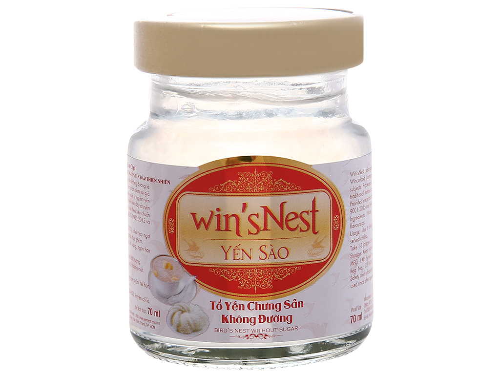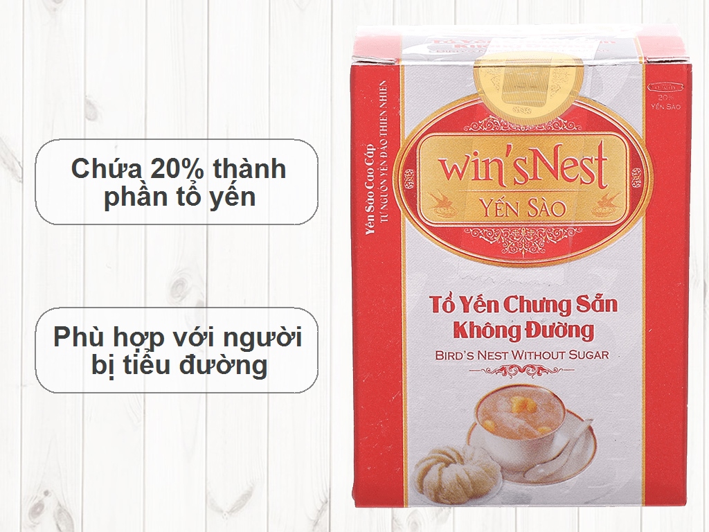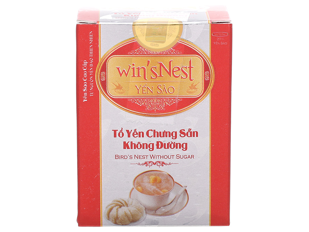Mua tại TiktokYẾN SÀO WIN'SNEST TỔ YẾN CHƯNG SẴN KHÔNG ĐƯỜNG 20% Sản phẩm thích hợp cho người ăn kiêng, người bị tiểu đường Bổ dưỡng - Giảm mệt mỏi - Chống lão hóa Tăng sức đề kháng - Phục hồi sức khỏe Yến sào cao cấp win'sNest tổ yến chưng sẵn không đường được sản xuất từ nguồn yến đảo thiên nhiên, là một sản phẩm của công ty wincofood. Được sản xuất bằng phương pháp cổ truyền trên dây chuyền đạt tiểu chuẩn an toàn thực phẩm. Đảm bảo theo tiêu chuẩn hệ thống chất lượng quốc tế ISO 9001:2015 và HACCP Thành phần cấu tạo: Nước, yến sào (20%), đường Isomalt, hương liệu dùng cho thực phẩm.Các chỉ tiêu chất lượng: Protein,canxi, năng lượng.