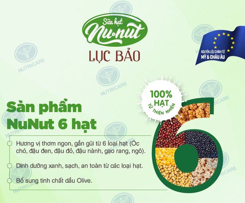 Sữa Nunut 6 hạt Ngọc Lục Bảo là sản phẩm sinh dưỡng cho cả gia đình (trẻ em >4 tuổi) đến từ 6 loại hạt cao cấp, nhập khẩu từ Châu Âu và được sản xuất từ công ty Nutricare Việt Nam