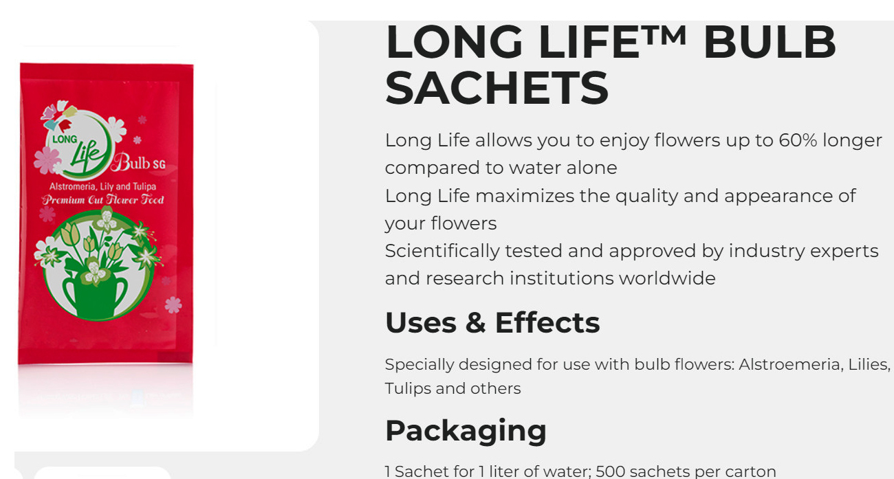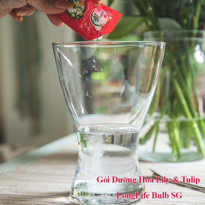- Có thể pha thêm thuốc cắm hoa Longlife Bulbs để duy trì hoa tiếp tục tươi lâu tại nhà, tại bình cắm hoa và tại Shop Hoa Giá bán gói thuốc dưỡng hoa Tulip và Lily đặc biệt Premium Longlife Bulbs cũng bằng giá thuốc cắm hoa Longlife 5gr màu xanh của Israel. Tuy nhiên, gói dưỡng hoa Tulip có trọng lượng lớn hơn đến 10gr và pha được 1L nước cắm hoa nên giá cũng bằng giá 2 gói thuốc cắm hoa thông thường
