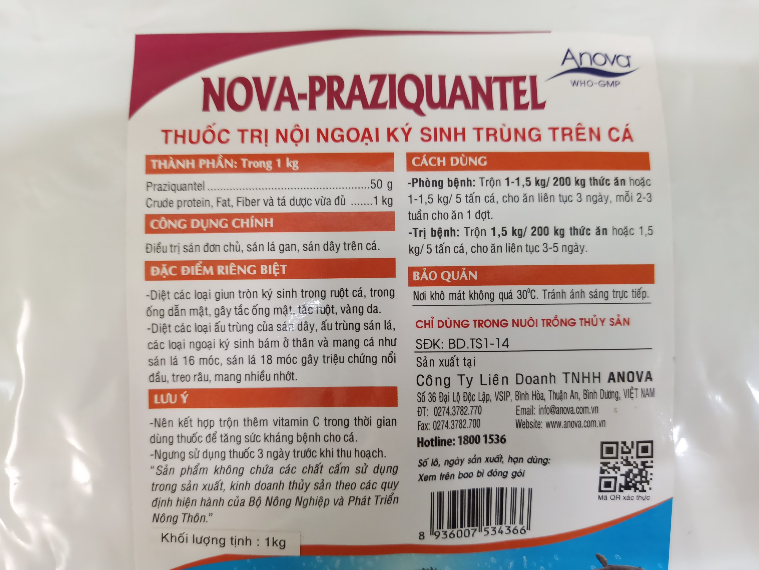 Mua tại TiktokThuốc Ngăn Ngừa Nội – Ngoại Ký Sinh Trùng Trên Cá Nova – Praziquantel Mã hàng: Nova – Praziquantel Hãng sản xuất: Anova – Việt Nam Quy cách: 1kg/gói THÀNH PHẦN: