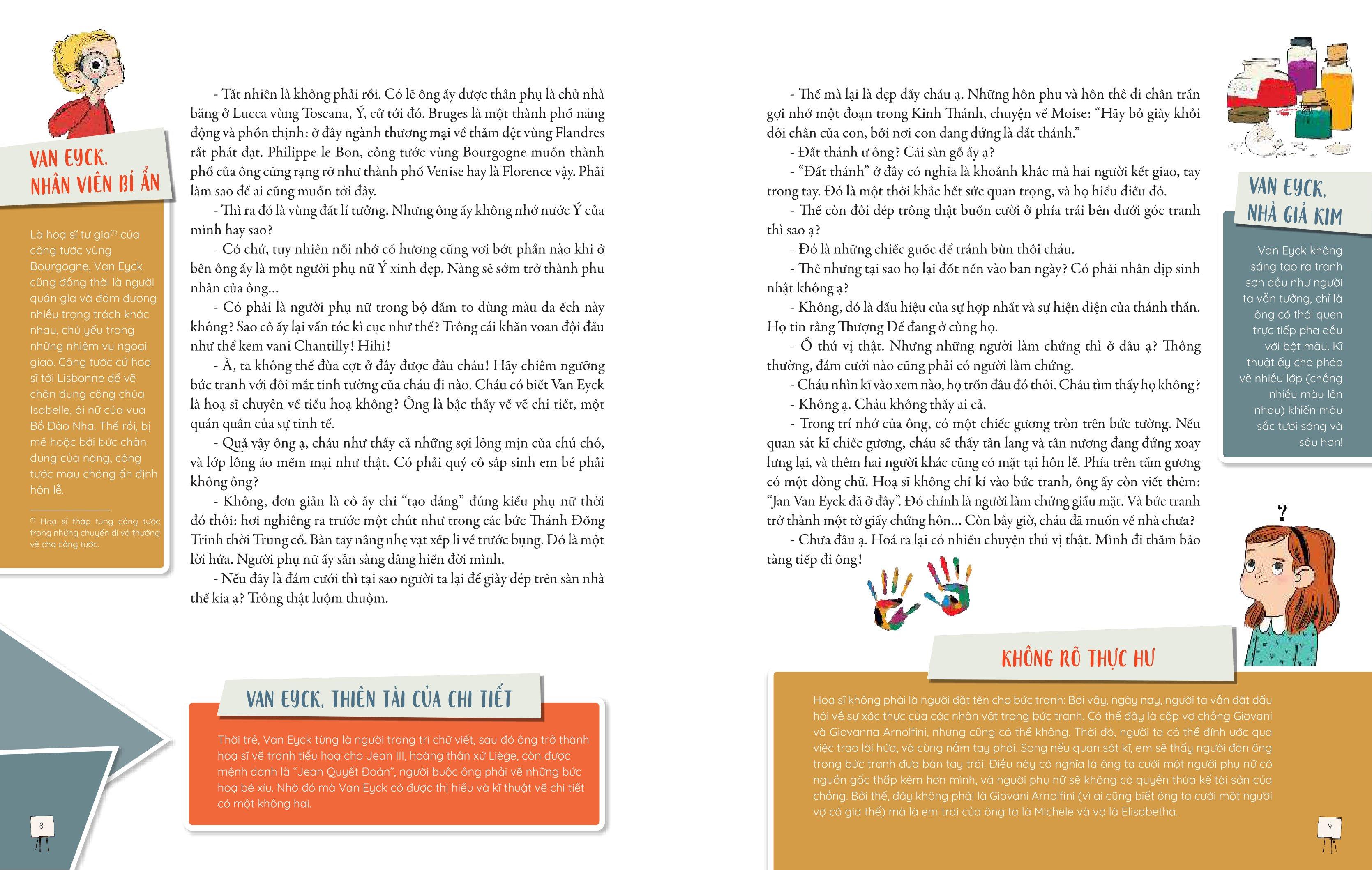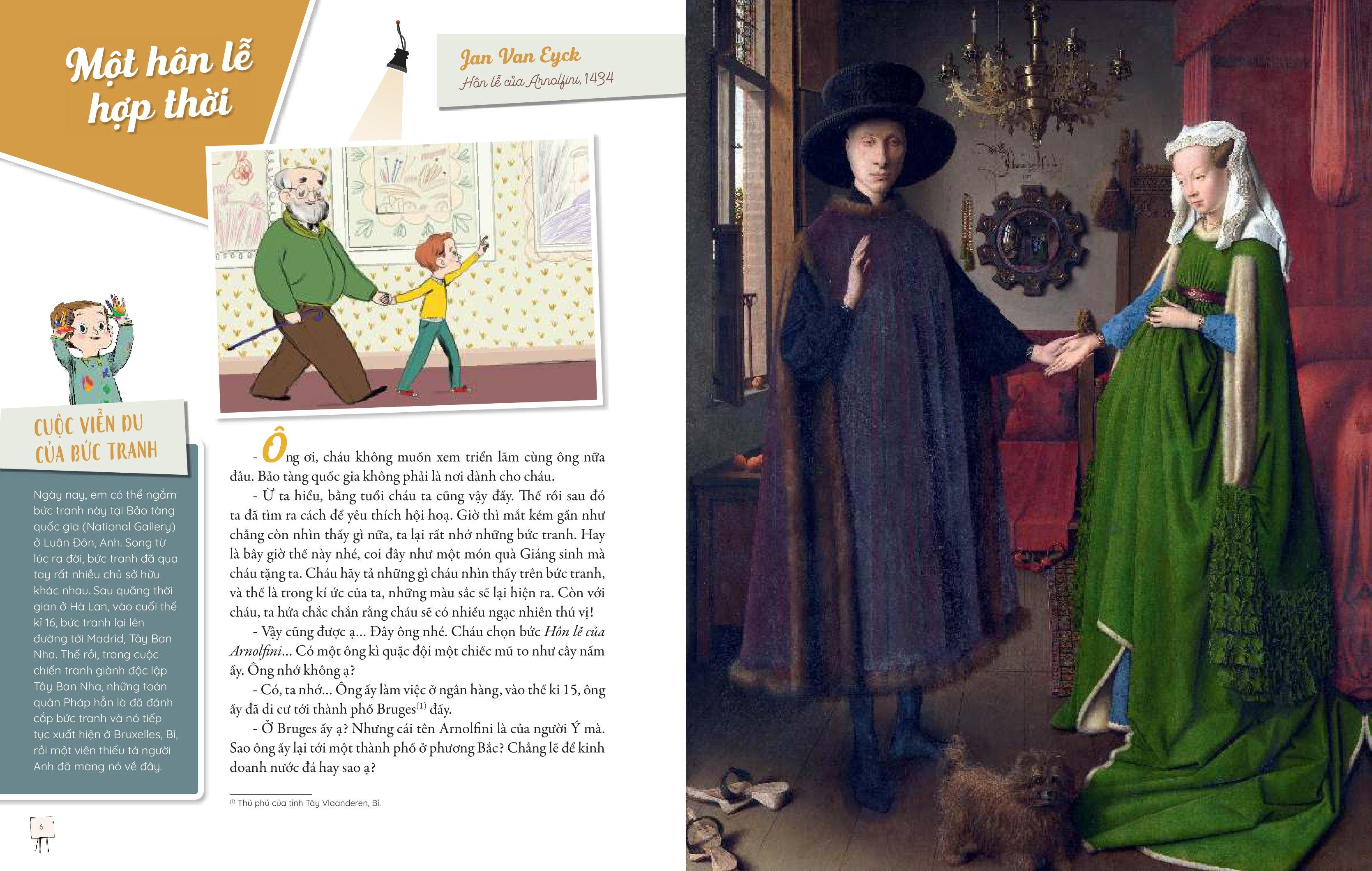 Đó là mẩu chuyện về họa sĩ Sandro Botticelli đập vỡ trứng để trộn màu trong quá trình sáng tác Sự ra đời của thần Vệ Nữ, bật mí danh tính của quý bà trong bức tranh Mona Lisa của Leonardo da Vinci, hay phân tích tâm lí của các nhân vật xuất hiện trong Sự trở về của đứa con hoang đàng của Rembrandt, câu chuyện hậu trường trong Lớp học múa – Edgar Degas, hoặc lời tự thuật của tác phẩm Guerncia về điều tác giả Picasso muốn thể hiện thông qua hình ảnh trong