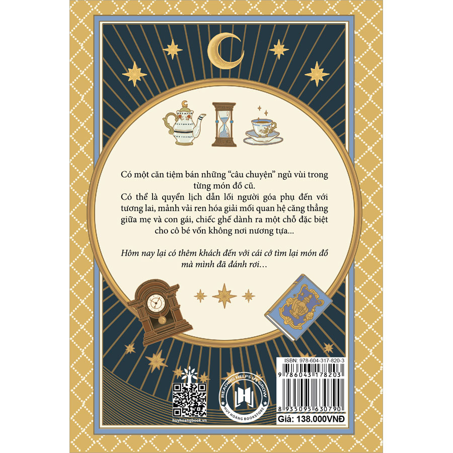 GIỚI THIỆU TÁC PHẨM Có một căn tiệm bán những "câu chuyện" ngủ vùi trong từng món đồ cũ. Có thể là quyển lịch dẫn lối người goá phụ đến với tương lai, mảnh vải ren hoá giải mối quan hệ căng thẳng giữa mẹ và con gái, chiếc ghế dành ra một chỗ đặc biệt cho cô bé vốn không nơi nương tựa hôm nay lại có thêm khách đến với cái cơ tìm lại món đồ mà mình đã đánh rơi