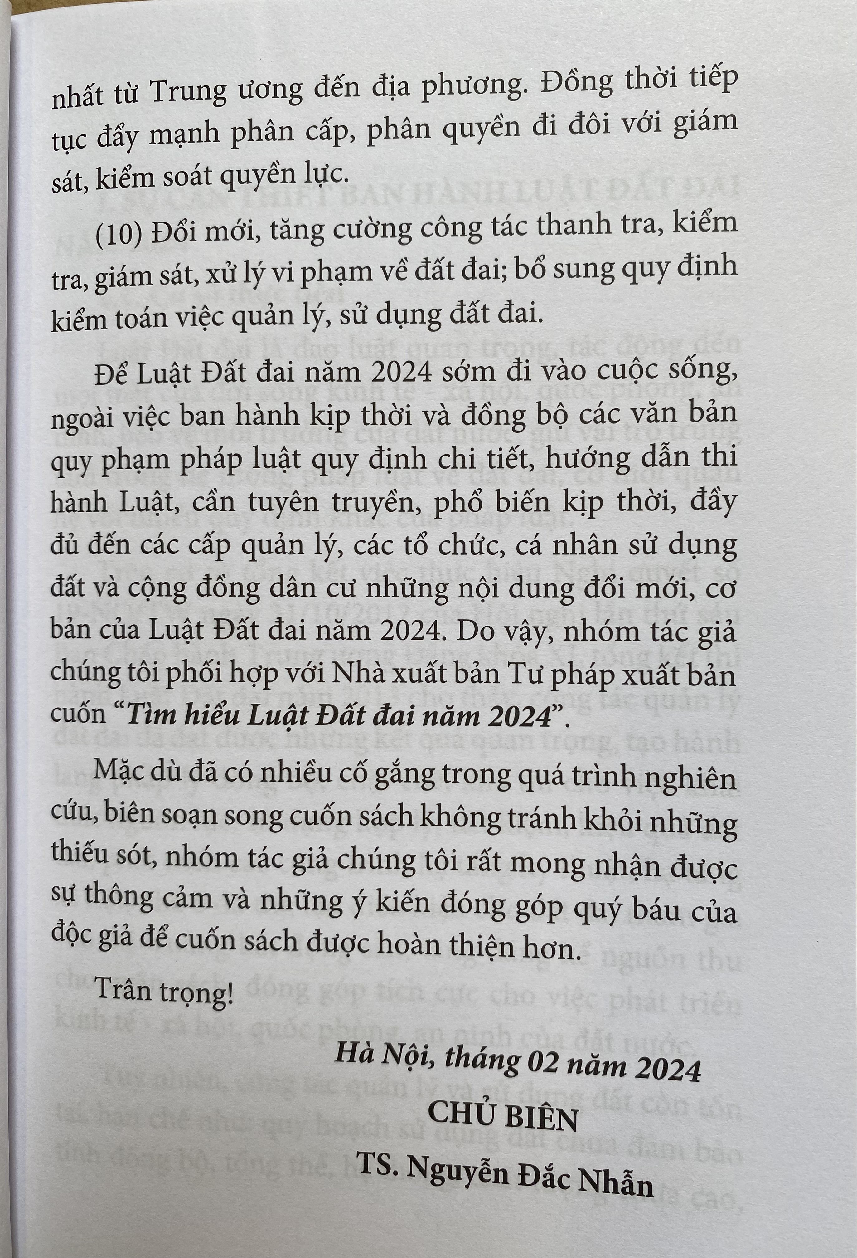Với mục đích giúp bạn đọc hiểu những quy định mới của Luật Đất đai năm 2024, Nhà xuất bản Tư pháp xuất bản cuốn "Tìm hiểu Luật Đất đai năm 2024" do TS. Nguyễn Đắc Nhẫn - Phó Vụ trưởng Vụ Đất đai, Bộ Tài nguyên và Môi trường làm chủ biên cùng với các tác giả là những người trực tiếp tham gia quá trình xây dựng Luật Đất đai năm 2024 biên soạn. Cuốn sách tập trung nêu và phân tích những nội dung mới, cơ bản của Luật Đất đai năm 2024.