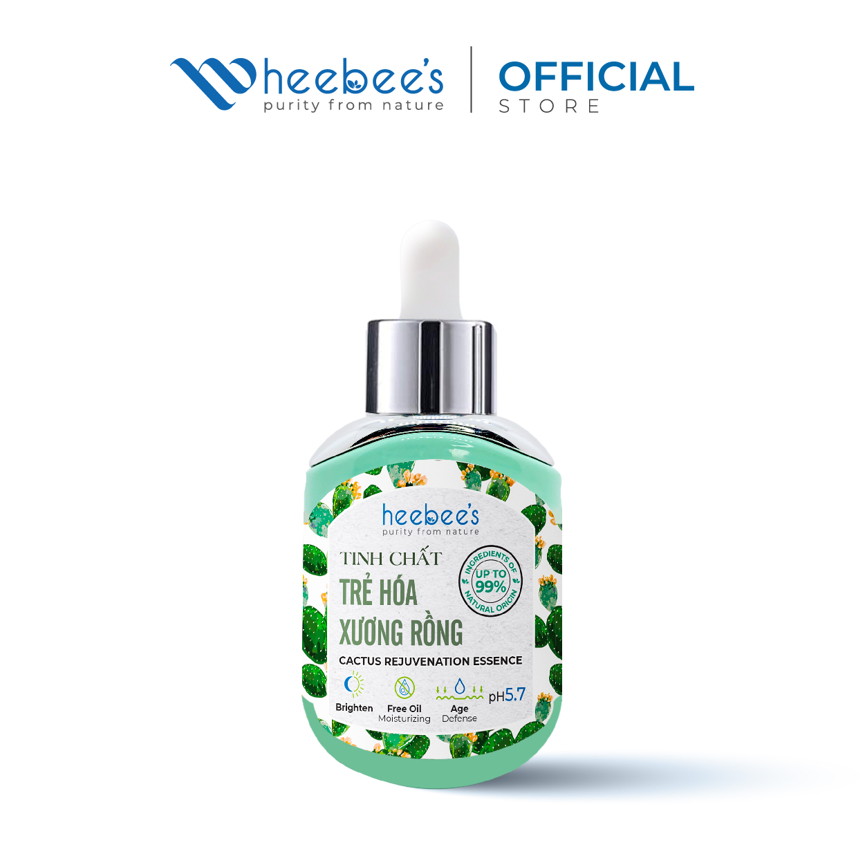 Tinh Chất Trẻ Hoá Xương Rồng Làm Trắng Da, Mịn Màng Và Căng Bóng Khai thác những tinh túy trong khả năng dưỡng ẩm và trẻ hóa da từ các loại thực vật nhiệt đới đặc trưng của Việt Nam, Tinh Chất Trẻ Hóa Xương Rồng Heebee với hàm lượng tự nhiên lên tới 99.9% là một sản phẩm giúp tái sinh làn da, sở hữu quyền năng 3in1 dưỡng trắng, dưỡng mịn căng bóng và đẩy lùi lão hóa. Công thức dưỡng Oil_free với hệ thống dưỡng thực vật tinh khiết không chứa dầu, màu xanh rêu tự nhiên từ thực vật, nhẹ êm như nước, và thẩm thấu nhanh mà không gây nặng bí hoặc nhờn rít da. CÔNG DỤNG CỦA TINH CHẤT TRẺ HOÁ XƯƠNG RỒNG Nét đột phá của sản phẩm Tinh Chất Trẻ Hoá Xương Rồng Heebee đến từ việc phát triển thành công Chiết xuất Xương Rồng với kỹ thuật siêu âm đến từ đội ngũ nghiên cứu Heebee. Xương rồng vốn là loài cây sở hữu nhiều hoạt chất chống oxy hóa và phục hồi, nhờ vào kỹ thuật trích ly công nghệ cao đã giúp thu hoạch trọn vẹn các hoạt chất thành phần chất lượng như piscidic acid, isorhamnetin... Những hoạt chất này có khả năng vượt trội trong việc thúc đẩy sự sản sinh collagen tự nhiên và cân bằng độ ẩm làn da, đồng thời tạo sự cân bằng hệ vi sinh duy trì độ ẩm thiết yếu cho làn da, đẩy nhanh quá trình làm lành các tổn thương, tăng khả năng tự bảo vệ của da trước các tác động xấu từ môi trường, sinh lý và tuổi tác, làm chậm quá trình oxy hóa da và ngăn ngừa dấu hiệu lão hóa và dưỡng da mịn màng, đều màu, trẻ trung. Hệ thống trẻ hóa của Tinh Chất nhờ vào các hoạt tính đắt giá được Heebee trực tiếp nghiên cứu và khai thác từ nguồn thực vật đặc trưng Việt Nam kết hợp cùng nguồn nguyên liệu đạt chứng nhận Hữu Cơ ECOCERT COSMO của Châu Âu, tạo nên hệ thống dưỡng da thực vật chất lượng cao giúp chống lại sự hình thành hắc tố melanin, đồng thời làm chậm quá trình oxy hóa dưới da, phục hồi và thúc đẩy tái tạo tế bào da mới một cách vượt trội và duy trì vẻ đẹp tự nhiên bền lâu. Sự kết hợp của chiết xuất Xương Rồng cùng chiết xuất từ lá Chùm Ngây tạo nên công thức đột phá chống lại các gốc tự do gây lão hóa, phục hồi làn da bị tổn thương, tăng cường hệ miễn dịch và sức sống của tế bào da trước sự xâm nhập của các gốc tự do từ môi trường hay sinh lý. Sự xuất hiện của Vitamin B5 Panthenol và chiết xuất từ cây Nha Đam giúp giúp xoa dịu các dấu hiệu kích ứng, xây dựng hàng rào bảo vệ lý tưởng cân bằng hệ vi sinh có lợi trên da và chủ động cung cấp dưỡng chất, kích thích tạo ra elastin và collagen tự nhiên cho vùng hạ bì, se mịn lỗ chân lông bằng cách lấp đầy các khoảng lồi lõm dưới da (nguyên nhân sinh ra nếp nhăn do tuổi tác). Kỹ thuật siêu âm chiết xuất lá Chùm Ngây giúp bảo toàn các flavonoid; đóng góp một lượng lớn hàm lượng vitamin C thực vật và kẽm tự nhiên dưới sự trợ dẫn tăng hoạt tính của Niacinamide, giúp tăng độ đàn hồi, tạo sự săn chắc và dưỡng trắng da một cách lành tính và hiệu quả bất ngờ. Làm sáng các vùng da xỉn màu, ngăn chặn và giảm sự hình thành các đốm nâu, nám và tàn nhang. Đồng thời giảm thiểu đáng kể tình trạng lỗ chân lông to, dư dầu nhờn hoặc bị khô ráp thiếu sức sống. Tinh Chất Trẻ Hóa Xương Rồng có kết cấu dạng gel, nhẹ, thấm nhanh mà không gây bết dính sau khi thoa, pH 5,7 ± 0.5: