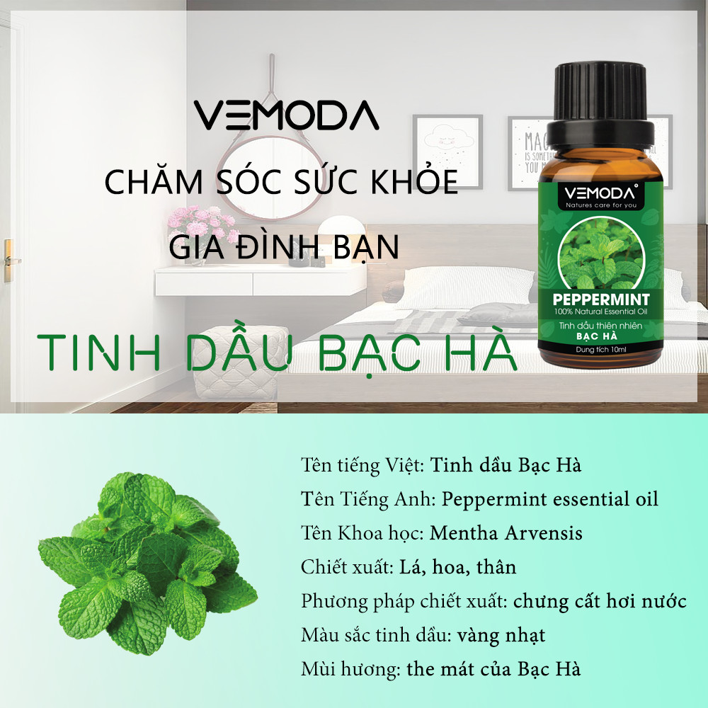 TINH DẦU BẠC HÀ CAO CẤP VEMODA 50ML Tinh dầu Bạc hà cao cấp Vemoda 50ML giúp thư giãn, kháng khuẩn, thanh lọc không khí, giải cảm, xua đuổi côn trùng, chăm sóc răng miệng Tinh dầu Bạc hà cao cấp Vemoda được nhập khẩu trực tiếp từ Ấn Độ, một trong những quốc gia sản xuất tinh dầu hàng đầu thế giới. Các sản phẩm tinh dầu Vemoda đều được tiến hành lấy mẫu và kiểm nghiệm tại Trung tâm kỹ thuật tiêu chuẩn đo lường chất lượng 3 (QUATEST 3)/ Tổng cục tiêu chuẩn đo lường chất lượng để đảm bảo chất lượng sản phẩm đúng tiêu chuẩn và tốt nhất cho khách hàng. Với Vemoda, an toàn sức khỏe người tiêu dùng luôn được đặt lên hàng đầu. NGUỒN GỐC VÀ CHẤT LƯỢNG TINH DẦU BẠC HÀ – PEPPERMINT ESSENTIAL OIL