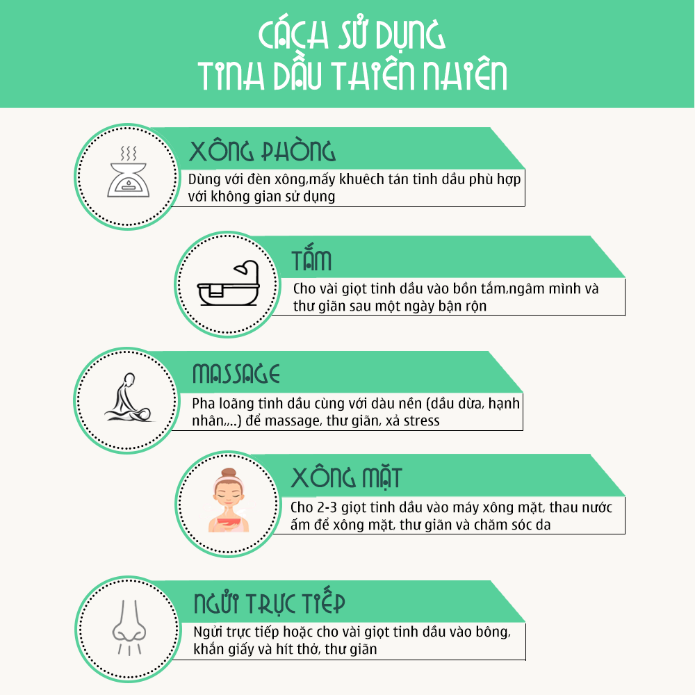 • Không uống trực tiếp tinh dầu nguyên chất, tránh tiếp xúc với mắt.