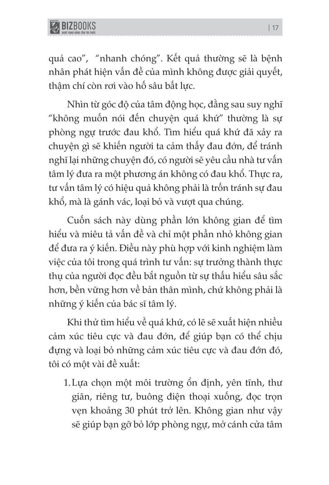 Tác giả cho rằng: “Sự trưởng thành thực sự của người đọc đều bắt nguồn từ sự thấu hiểu sâu sắc hơn, bền vững hơn về bản thân m.ình, chứ không phải từ lời khuyên của chuyên gia tư vấn”. Có lẽ chính vì vậy mà nội dung cuốn sách cũng rất ít những lời khuyên mà tập trung đi thẳng vào gốc rễ những vấn đề bạn gặp phải, giúp bạn dễ dàng thấu hiểu và chấp nhận bản thân, từ đó có thể chủ động đưa ra lựa chọn và kiểm soát cuộc sống của m.ình.