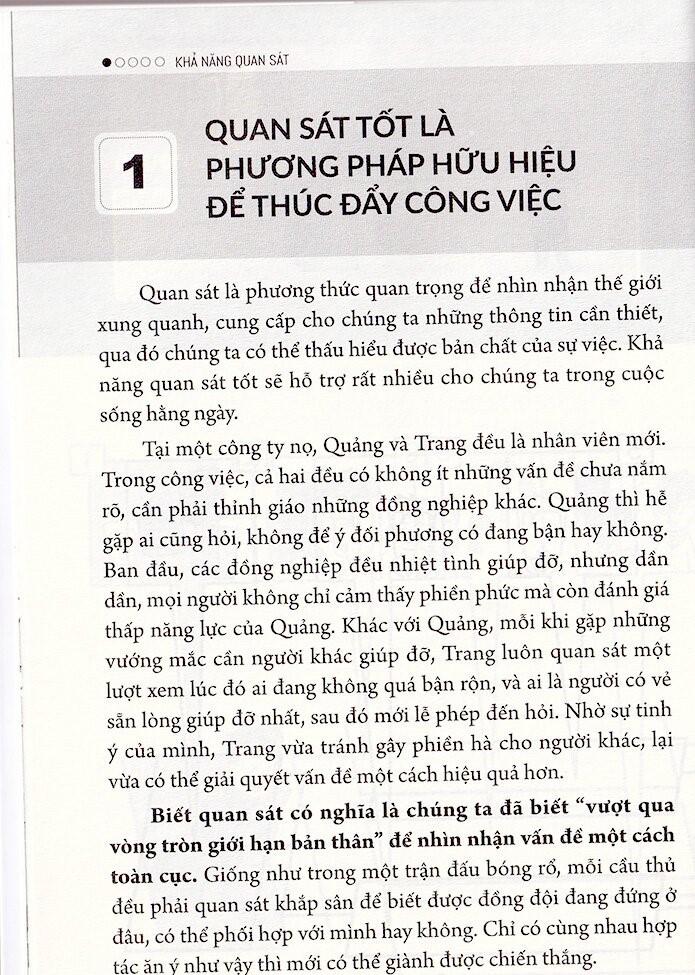 Biết quan sát có nghĩa là chúng ta đã biết “vượt qua vòng tròn giới hạn bản thân” để nhìn nhận vấn đề một cách toàn cục. Giống như trong một trận đấu bóng rổ, mỗi cầu thủ đều phải quan sát khắp sân để biết được đồng đội đang đứng ở đâu, có thể phối hợp với m.ình hay không. Chỉ có cùng nhau hợp tác ăn ý như vậy thì mới có thể giành được chiến thắng.