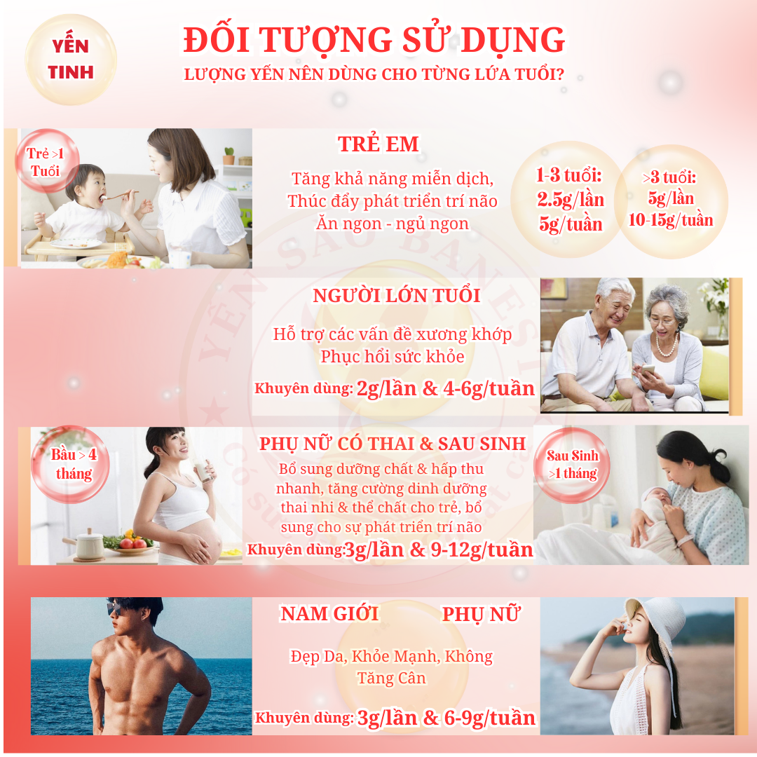 - Yến sào đối với người lớn: - Giảm căng thẳng mệt mỏi, ngủ ngon, sâu giấc. - Tăng cường độ ẩm, giảm nếp nhăn, chống lão hóa, giúp da mịn màng, săn chắc; - Hỗ trợ