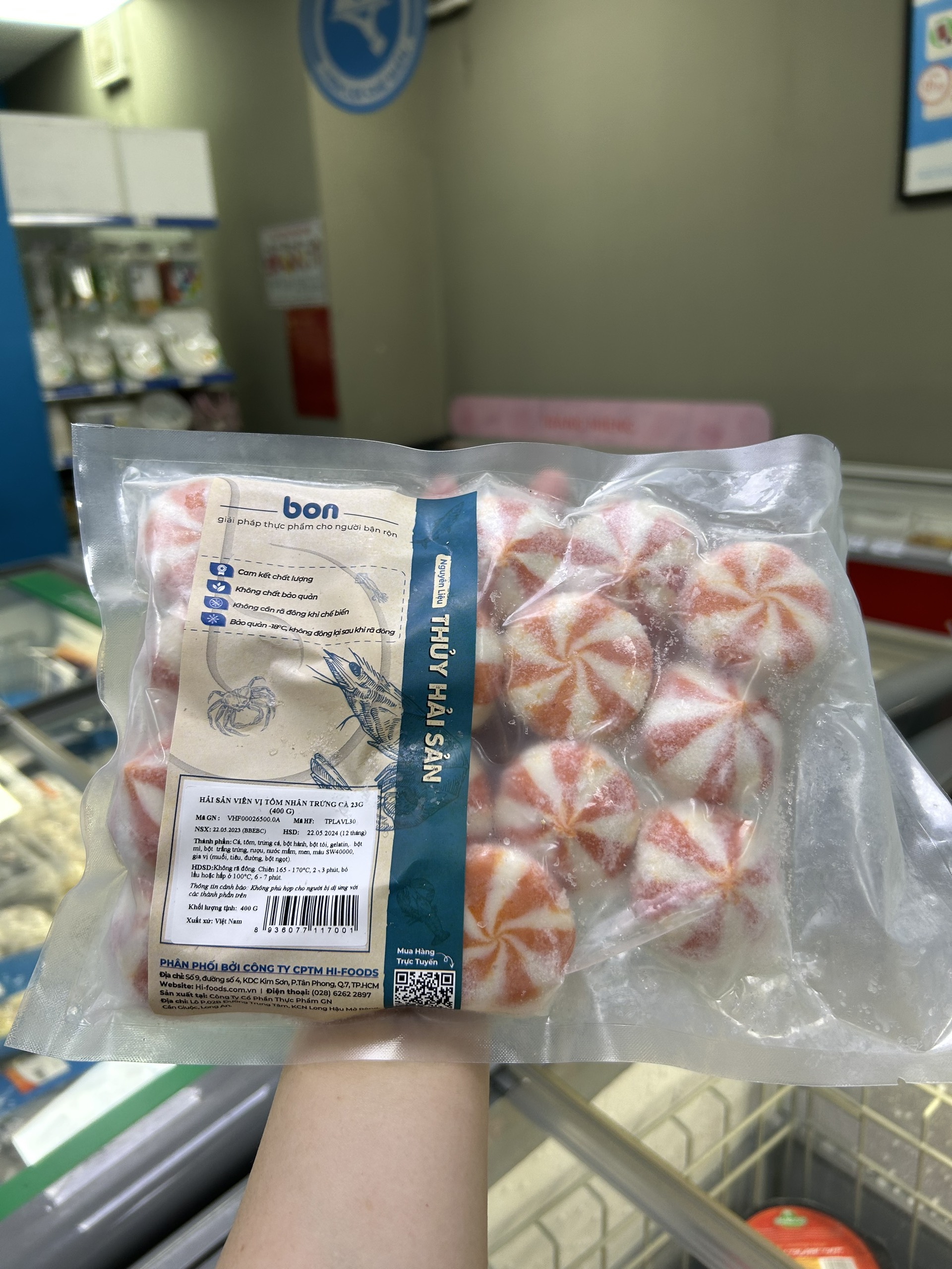 Mua tại TiktokVới sản phẩm tươi sống, trọng lượng thực tế có thể chênh lệch khoảng 10%. ĐỊNH LƯỢNG: 23g/cái x 400g/gói THÀNH PHẦN: Cá, tôm, trứng cá MÔ TẢ SẢN PHẨM: Vỏ ngoài tròn Có màu trắng sọc cam với có độ dai của chả cá nguyên chất , bên trong là nhân trứng cá tươi ngon cùng tiếng nổ đom đốp trong miệng của những viên trứng nhỏ CÁCH CHẾ BIẾN: Không rã đông. Chiên 165-170oC trong 3-4 phút, bỏ lẩu hoặc hấp ở 100oC trong 7-8 phút BẢO QUẢN: - Giữ đông từ -15 đến -18°C. Không đông lại sau khi rả đông - Bảo quản mát từ 0°C đến 5°C trong 3 ngày HSD: 12 tháng