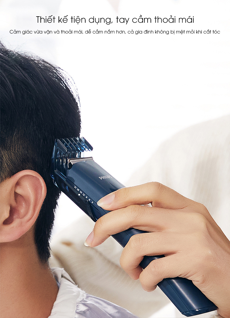 - Hệ thống cắt mạnh mẽ PowerDrive Sau 8 giờ sạc, 45 phút cắt tóc không dây Sau 8 giờ sạc, nó có thể được sử dụng trong 45 phút mà không cần kết nối nguồn. Khuyến cáo bạn nên sử dụng tông đơ cắt tóc khi chưa kết nối với nguồn điện, nếu cắt tóc mất điện một nửa thì bạn cũng có thể sử dụng khi đang sạc. Hai lưỡi sắc bén đảm bảo trải nghiệm cắt tóc nhanh chóng Dao di chuyển được với khả năng mài hai mặt đảm bảo cắt tóc hiệu quả mà không cần kéo. Dễ dàng chọn và khóa 7 cài đặt chiều dài: 3-21 mm Không cần thay lược thường xuyên khi cắt tóc, lược trượt được thiết kế mới có thể dễ dàng lựa chọn 7 độ dài khác nhau, từ 3 đến 21 mm, độ chính xác là 3 mm. Đơn giản và thuận tiện, nó có thể được điều chỉnh bằng một tay, và rất dễ dàng cho người mới bắt đầu. Hệ thống cắt mạnh mẽ PowerDrive để cắt hiệu quả Động cơ mạnh mẽ là 5.500 vòng / phút và sức mạnh đang tăng vọt. Đầu cắt chất lượng cao, bền Đầu dao cắt bằng thép không gỉ chất lượng cao cho phép cắt tỉa sắc nét mà không làm bết tóc. Được làm bằng thép không gỉ, nó vẫn sắc nét như cũ sau thời gian dài sử dụng. Thiết kế răng tròn đảm bảo chăm sóc da đầu Thiết kế răng tròn đặc biệt giúp tiếp xúc với da đầu an toàn và đáng tin cậy. Bảo vệ da đầu khỏi những vết xước hoặc vết cắt do tai nạn. 58 decibel hoạt động tiếng ồn thấp, tận hưởng một mái tóc thoải mái Âm thanh khi chạy nhỏ hơn 58 decibel *, giống như tiếng nước chảy róc rách, hãy tận hưởng trải nghiệm cắt tóc mềm mại và thoải mái. Thiết kế tiện dụng, cầm thoải mái Thân máy được thiết kế công thái học dễ cầm nắm, tạo cảm giác vừa vặn và thoải mái.