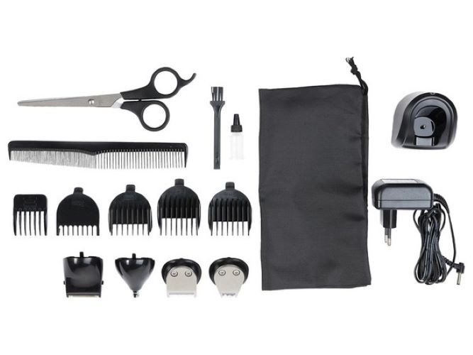 Bao gồm kéo, lược, dầu, bộ đổi nguồn AC, trạm sạc, bàn chải làm sạch và hộp đựng