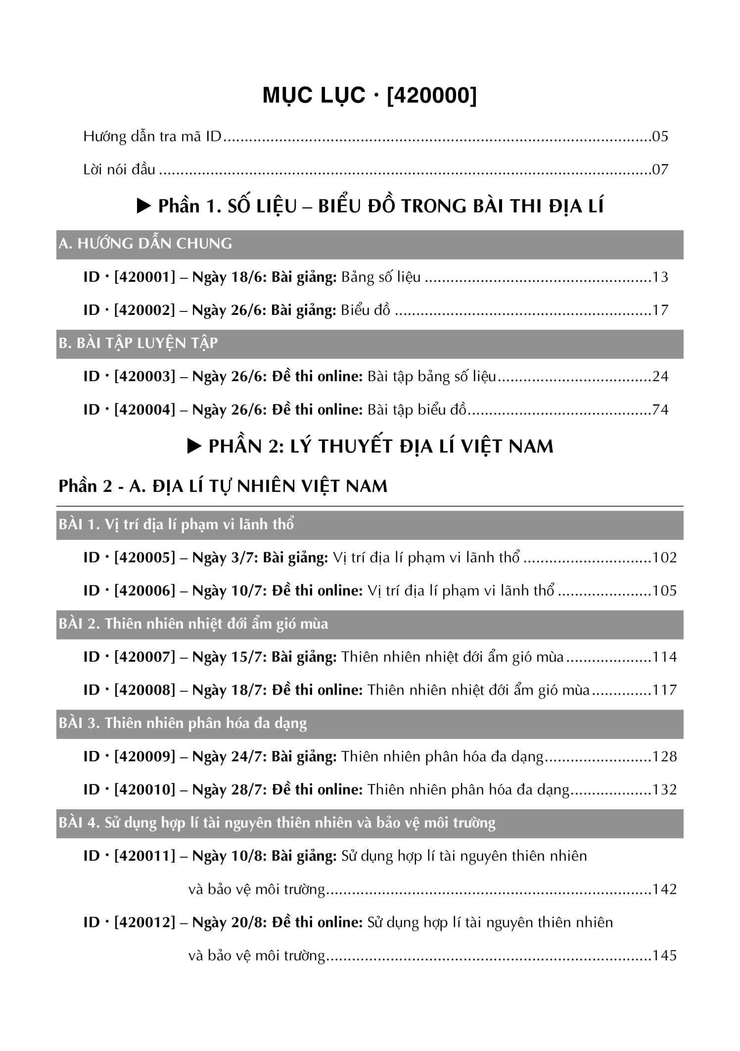 - Tập 1: Số liệu - Biểu đồ , địa lí tự nhiên địa lí dân cư Việt Nam Theo dạng thức đề thi mới , đối với môn địa lí, kỹ năng xử lý số liệu và biểu đồ chiếm tỉ lệ rất lớn, việc nắm vững các công thức xử lý số liệu sẽ giúp học sinh giải quyết tốt các câu hỏi Đúng/sai và trả lời ngắn trong đề bài. So với dạng thức cũ, những câu hỏi liên quan đến phần này chiếm số lượng nhiều hơn hẳn và độ khó cũng được tăng lên do đó việc ôn tập các công thức này một cách tổng hợp là điều rất quan trọng.