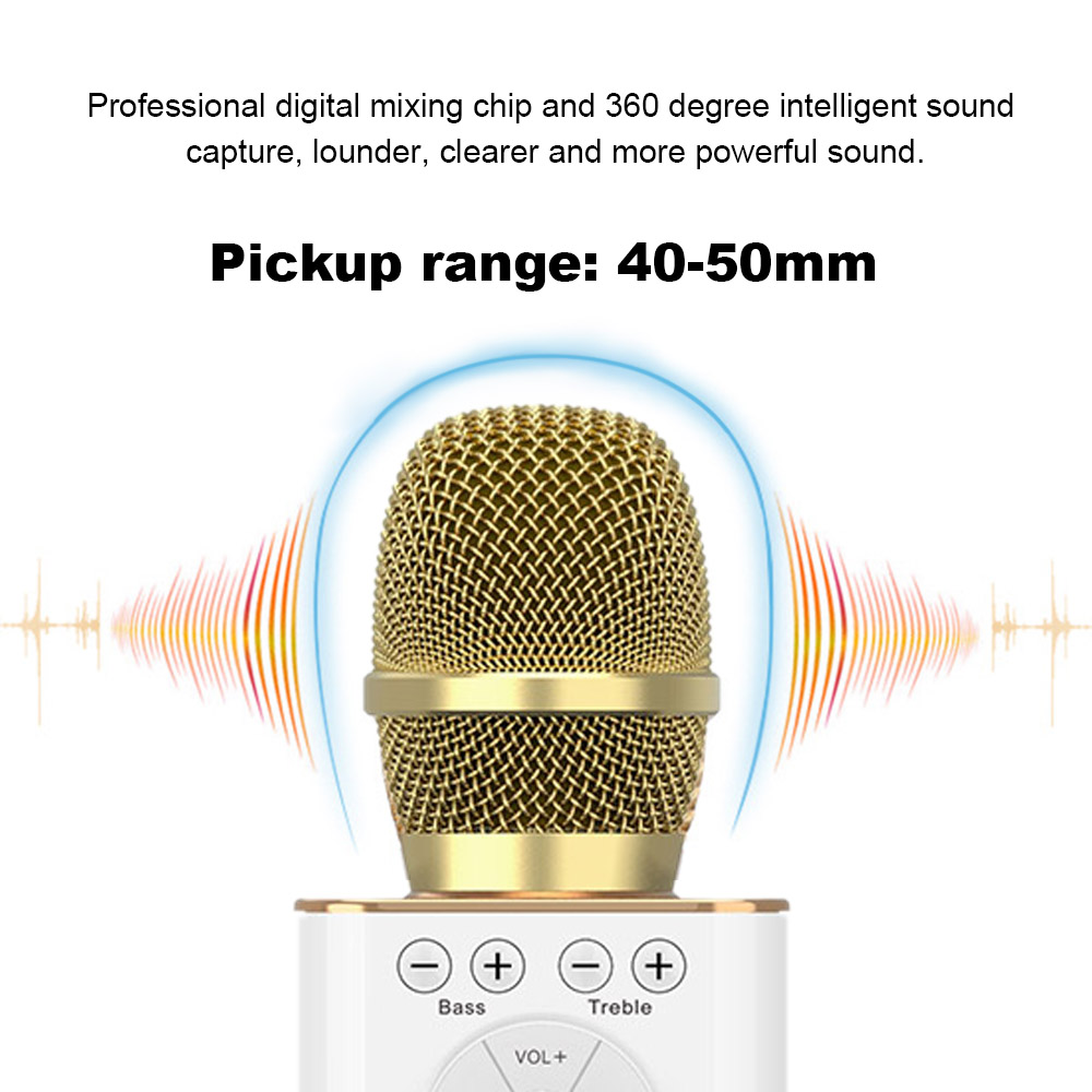 Features: It adopts BT V4.2 technology and is compatible with most BT devices such as smartphone and tablet, which not only reduces standby power consumption, but also improves transmission distance and stability. Intelligent noise reduction capacitive pickup, singing without howling, recording without breaking sound, to achieve real low noise and high fidelity, clear and delicate voice. Enhanced with 5W2 stereo drivers, Professional digital mixing chip and 360 degree intelligent sound capture, lounder, clearer and more powerful sound. Multi-function adjustment panel, with individual treble volume, bass volume, echo effect volume, music volume, and voice singing volume adjustment, you can get the sound just the way you want it. It built-in 2600mAh rechargeable battery, gives you up to 6-8 hours fun, Repeatedly charged it without replacing batteries. Support AUX output and Android for IOS/PC , your singing voice will be easy and fast connect to BT speaker, Amplifier singing machine, Laptop and computer etc audio player and devices. With AUX output function, more choice for other non-BT player or devices with AUX function. You can also insert the USB devices through that USB port. Specifications: Brand Name: TOSING 04 Type: Microphone Pickup: Capacitive Reverberation: Echo Material: Aluminum alloy+Magnesium alloy Color: Gold/Red/Black(Optional) Output: 5W2(Speaker) Frequency range: 100Hz -10KHz SPL: 115dB 1KHz THD1% Charging Supply: DC5V BT version: V4.2 Battery:Built-in Lithium Battery Battery capacity: 2600mAh Battery working time: 6-8 hours Item Size: 25 6.7 6.7cm / 9.8 2.6 2.6in Package Size: 30 14 8cm / 11.8 5.5 3.1in Package Weight: 519g / 18.3oz Package List: 1 Karaoke Microphone 1 USB Cable 1 Audio Cable 1 Storage Box 1 * Instruction Manual