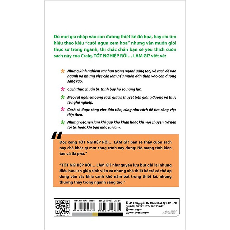 Dù mới gia nhập vào con đường thiết kế đồ họa, hay chỉ tìm hiểu theo kiểu “cưỡi ngựa xem hoa” nhưng vẫn muốn giỏi thực sự trong ngành, thì chắc chắn bạn sẽ yêu thích cuốn sách này của Craig. TỐT NGHIỆP RỒI… LÀM GÌ? viết về: Những kinh nghiệm cá nhân trong ngành sáng tạo, về cách để vào ngành và những việc cần làm nếu muốn dấn thân vào con đường sáng tạo. Cách thức chuẩn bị, trình bày hồ sơ năng lực. Mẹo rút ngắn khoảng cách giữa lí thuyết trên giảng đường và thực tế nghề nghiệp. Cách có được công việc đầu tiên, cũng như cách để tìm công việc tiếp theo. Những việc nên làm khi gặp khó khăn hoặc khi mọi chuyện trở nên tồi tệ, hoặc khi bạn mắc sai lầm. Đọc xong TỐT NGHIỆP RỒI… LÀM GÌ? bạn sẽ thấy cuốn sách này chả khác gì một công trình xây dựng: Nó mang tính kiến tạo và đả phá.”