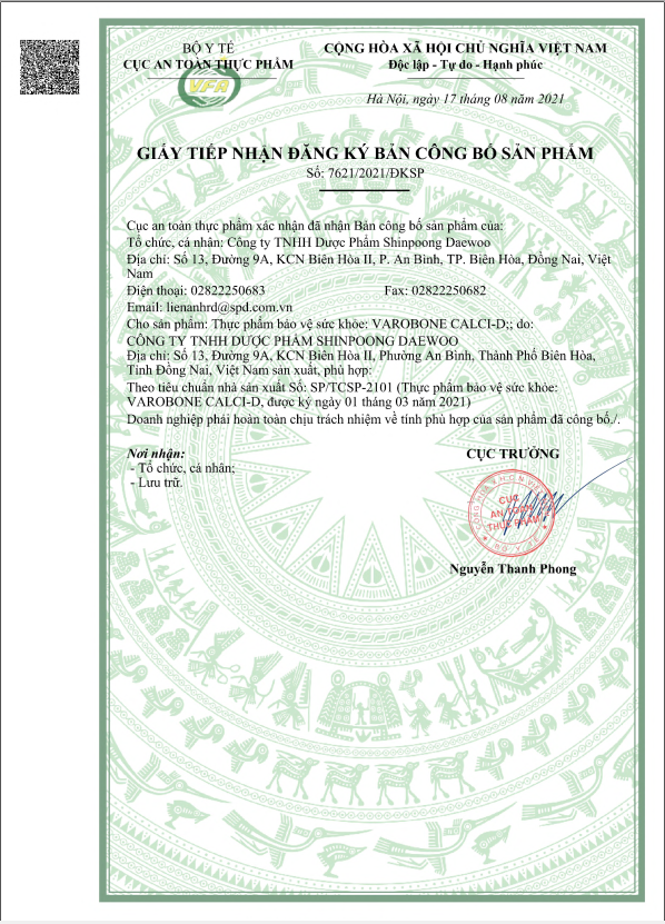 Đặt cam kết: “Vì sức khỏe mọi người” vào từng sản phẩm, Shinpoong Pharma không ngừng nỗ lực tạo nên những giải pháp toàn diện về sức khỏe dựa trên gần 63 năm nghiên cứu khoa học, thành tựu về công nghệ và nguyên liệu chất lượng nhập khẩu, tuyển chọn từ các chuyên gia hàng đầu tại Hàn Quốc và Việt Nam. THỰC PHẨM BẢO VỆ SỨC KHỎE | VAROBONE OSTEO - Viên uống bổ sung CALCI, Vitamin D3 Hỗ trợ cải thiện tình trạng loãng xương ở người lớn; cải thiện xương và răng chắc khỏe THÀNH PHẦN - Calci carbonat (tương đương 400 mg Calci) . 1000 mg - Magnesi oxyd (tương đương 120 mg Magnesi) ... 199 mg - Kẽm gluconat (tương đương 10 mg Kẽm) ... 70 mg - Vitamin B6 (dưới dạng Pyridoxin hydroclorid) .... 2 mg - Vitamin D3 (dưới dạng Cholecalciferol) . 400 IU CÔNG DỤNG: Hỗ trợ cải thiện răng và xương chắc khỏe. Hỗ trợ cải thiện tình trạng loãng xương ở người lớn. Bổ sung Calci, vitamin D3 cho cơ thể. CÁCH DÙNG Người lớn và trẻ em trên 14 tuổi: 1 viên/lần x 1 – 2 lần/ngày, uống sau khi ăn sáng và ăn trưa. ĐỐI TƯỢNG SỬ DỤNG Người lớn và trẻ em trên 14 tuổi, phụ nữ có thai và cho con bú có nhu cầu bổ sung Calci, vitamin D3 cho cơ thể. Người lớn bị loãng xương BẢO QUẢN Trong bao bì kín, ở nơi khô, tránh ánh sáng, nhiệt độ dưới 30ºC. HSD: 36 tháng kể từ ngày sản xuất. QUY CÁCH