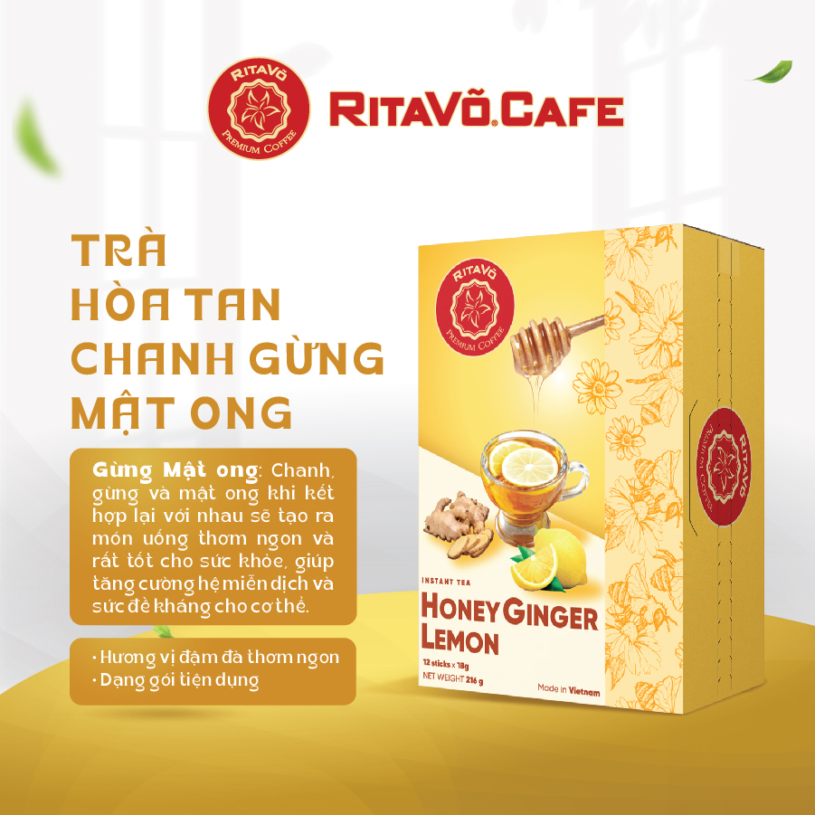 Trà hoà tan Rita Võ Chanh gừng mật ong tiện lợi cho việc pha chế và sử dụng là lựa chọn tuyệt vời cho những ngày bận rộn. Chanh, gừng và mật ong khi kết hợp lại với nhau sẽ tạo ra món uống thơm ngon và rất tốt cho sức khỏe, giúp tăng cường hệ miễn dịch và sức đề kháng cho cơ thể. Trọng lượng: Hộp 216g (gồm 12 gói x 18g) THÔNG TIN THƯƠNG HIỆU Rita Võ Cafe thuộc tập đoàn Rita Võ Group, suốt hành trình hơn 20 năm năm chinh phục khách hàng bằng hương vị cà phê tinh tế, Rita Võ luôn đặt nhiều tâm huyết để phục vụ Quý khách hàng những sản phẩm chất lượng cao, tự hào hương vị cà phê Việt.