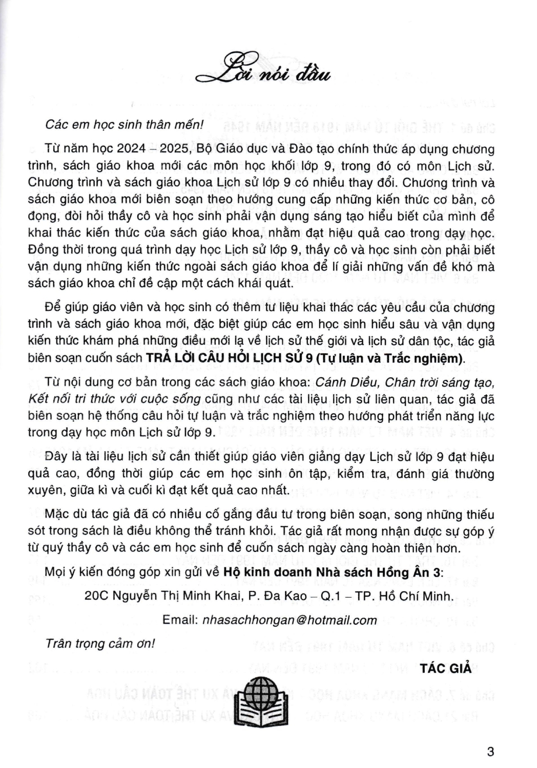 Trả Lời Câu Hỏi Lịch Sử Lớp 9 - Tự Luận & Trắc Nghiệm GIỚI THIỆU SÁCH: Từ năm học 2024 – 2025, Bộ Giáo dục và Đào tạo chính thức áp dụng chương trình, sách giáo khoa mới các môn học khối lớp 9, trong đó có môn Lịch sử. Chương trình và sách giáo khoa Lịch sử lớp 9 có nhiều thay đổi. Chương trình và sách giáo khoa mới biên soạn theo hướng cung cấp những kiến thức cơ bản, cô đọng, đòi hỏi thầy cô và học sinh phải vận dụng sáng tạo hiểu biết của mình để khai thác kiến thức của sách giáo khoa, nhằm đạt hiệu quả cao trong dạy học. Đồng thời trong quá trình dạy học Lịch sử lớp 9, thầy cô và học sinh còn phải biết vận dụng những kiến thức ngoài sách giáo khoa để lí giải những vấn đề khó mà sách giáo khoa chỉ đề cập một cách khái quát. Để giúp giáo viên và học sinh có thêm tư liệu khai thác các yêu cầu của chương trình và sách giáo khoa mới, đặc biệt giúp các em học sinh hiểu sâu và vận dụng kiến thức khám phá những điều mới lạ về lịch sử thế giới và lịch sử dân tộc, tác giả biên soạn cuốn sách Trả Lời Câu Hỏi Lịch Sử Lớp 9 - Tự Luận & Trắc Nghiệm. Từ nội dung cơ bản trong các sách giáo khoa: Cánh Diều, Chân trời sáng tạo, Kết nối tri thức với cuộc sống cũng như các tài liệu lịch sử liên quan, tác giả đã biên soạn hệ thống câu hỏi tự luận và trắc nghiệm theo hướng phát triển năng lực trong dạy học môn Lịch sử lớp 9. Đây là tài liệu lịch sử cần thiết giúp giáo viên giảng dạy Lịch sử lớp 9 đạt hiệu quả cao, đồng thời giúp các em học sinh ôn tập, kiểm tra, đánh giá thường xuyên, giữa kì và cuối kì đạt kết quả cao nhất. Mặc dù tác giả đã có nhiều cố gắng đầu tư trong biên soạn, song những thiếu sót trong sách là điều không thể tránh khỏi. Tác giả rất mong nhận được sự góp ý từ quý thầy cô và các em học sinh để cuốn sách ngày càng hoàn thiện hơn.