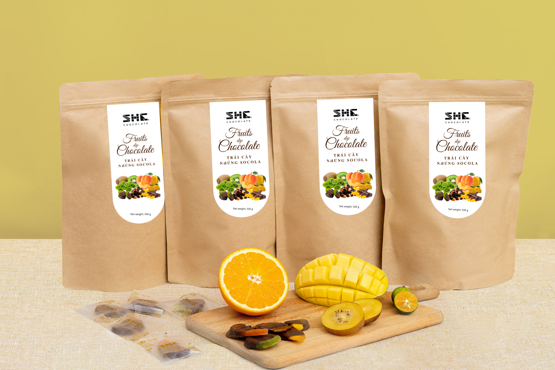 ✨Trái cây nhúng socola thập cẩm (Mix 4 vị Xoài, Cam, Kiwi) - túi 500g -SHE Chocolate - Đa dạng vị giác, bổ sung năng lượng. Quà tặng dịp lễ, người thân, thích hợp ăn vặt văn phòng