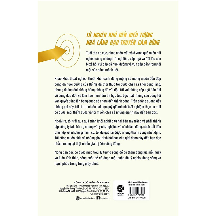 - (Phần tự giới thiệu về sách của tác giả) Tuổi thơ cơ cực, nhọc nhằn, vất vả ở vùng quê miền núi nghèo cùng những trải nghiệm, vấp ngã và đôi lúc còn bị xã hội vùi dập đã nuôi dưỡng và vun đắp dần trong tôi một sức sống mãnh liệt. Khao khát thoát nghèo, thoát khỏi cảnh đồng ruộng đã làm tôi có được nghị lực và bản lĩnh để đối diện, vượt qua những sóng gió, khó khăn sau này. Trải qua giai đoạn tuổi thơ như thế, tôi rút ra nhiều bài học quý giá mà chỉ có trải nghiệm thực sự mới có được, mới thấm được và tôi muốn chia sẻ những giá trị này đến bạn đọc. Ngoài ra, tôi trải qua quá trình khởi nghiệp từ hai bàn tay trắng và phải thành lập công ty tại nhà trọ nhưng với ý chí, nghị lực và cách làm đúng, cách bắt đầu phù hợp với những gì mình có, tôi đã gặt hái được những thành công nhất định. Tôi cũng muốn chia sẻ những giá trị và bài học của giai đoạn này đến bạn đọc nhằm mang lai thật nhiều giá trị đến cộng đồng. Mong bạn đọc có được mục tiêu, lý tưởng sống để có thêm động lực mỗi ngày và luôn tỉnh thức, sáng suốt để có được một hướng đi phù hợp, để từ đó có được hạnh phúc, có được một cuộc đời đáng sống và ý nghĩa nhất trong từng giây phút.