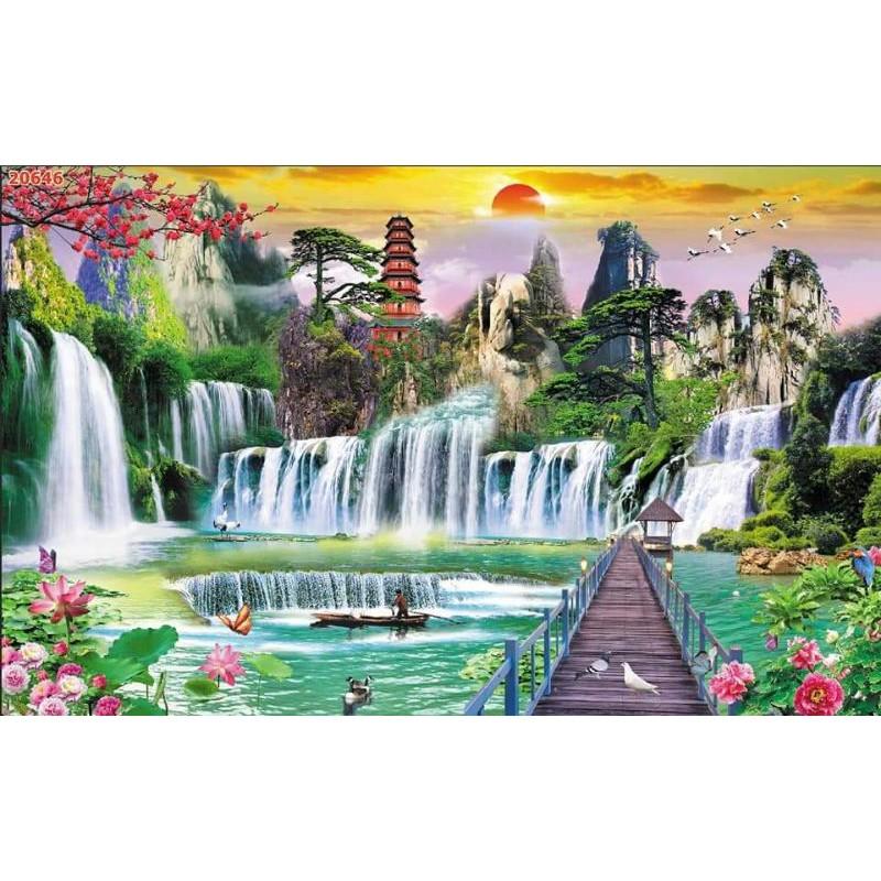 ✨Tranh dán tường 3D sơn thủy hữu tình , phong cảnh, thác nước nhận in theo kích thước yêu cầu