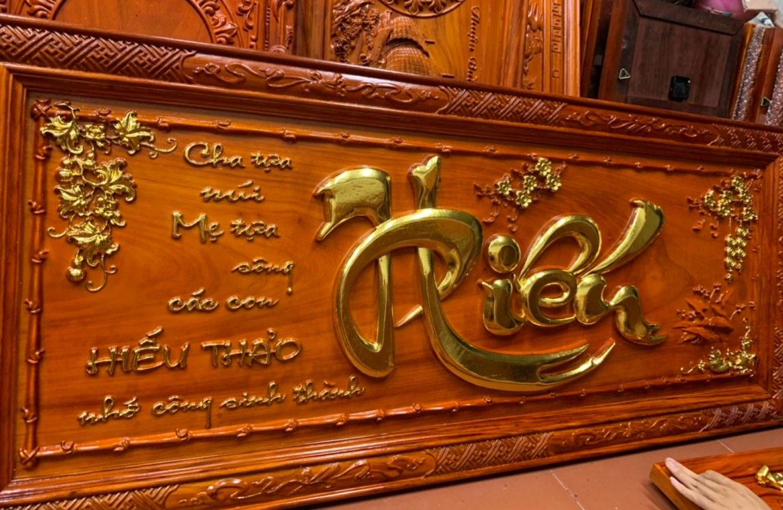 ✨Tranh điêu khắc chữ hiếu bằng gỗ hương đỏ và được sơn son dát vàng cao cấp kt 61×146×4cm