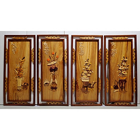 Tranh ghép gỗ nghệ thuật – xuân hạ thu đông – TÙNG CÚC TRÚC Tranh được chế tác bằng gỗ bạch tùng khung tranh gỗ hương và nhiều loại gỗ quý ,sơn Pu cao cấp Kích thước phủ khung 4192cm4buc