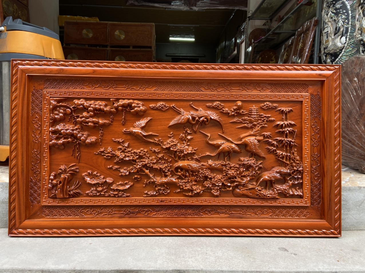 ✨Tranh gỗ treo tường trạm khắc tích cửu hạc du xuân bằng gỗ gõ đỏ kt 67×127×4cm