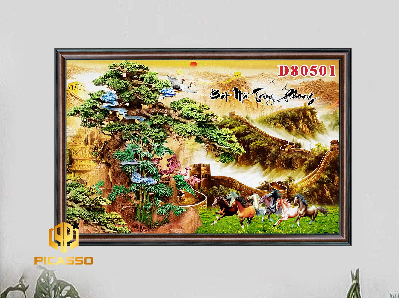 Khung Tranh : Khung tranh được làm từ chất liệu nhựa PVC giả gỗ, họa tiết nổi,màu sắc chân thực, Bản khung tranh 6cm