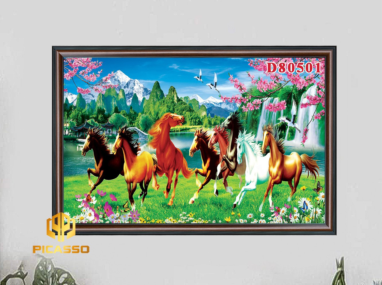 Khung Tranh : Khung tranh được làm từ chất liệu nhựa PVC giả gỗ, họa tiết nổi,màu sắc chân thực, Bản khung tranh 6cm