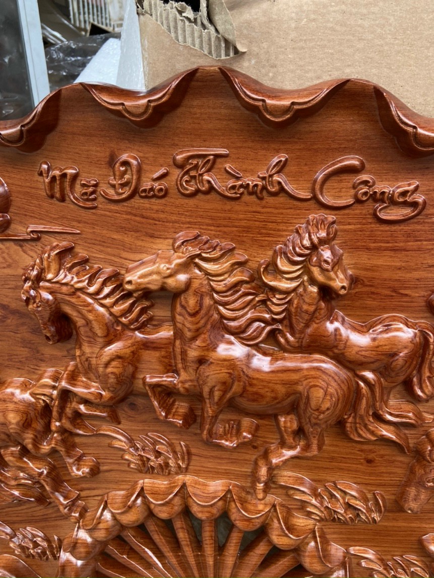 _ Tranh cánh quạt khắc tích mã đáo thành công được làm bằng chất chất liệu gỗ hương đỏ tự nhiên 100% _ Kt 50×100 dầy 4cm _ Tranh được khắc nổi tỉ mỉ ,tinh