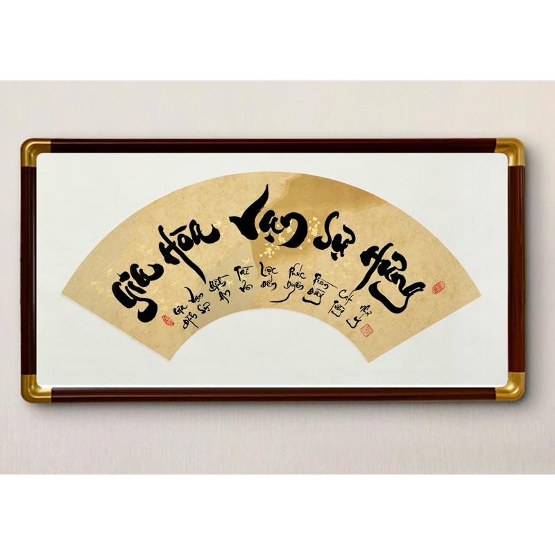 ✨Tranh thư pháp thủ công hình phiến diện (mặt quạt) đóng khung treo ngang 70x35cm