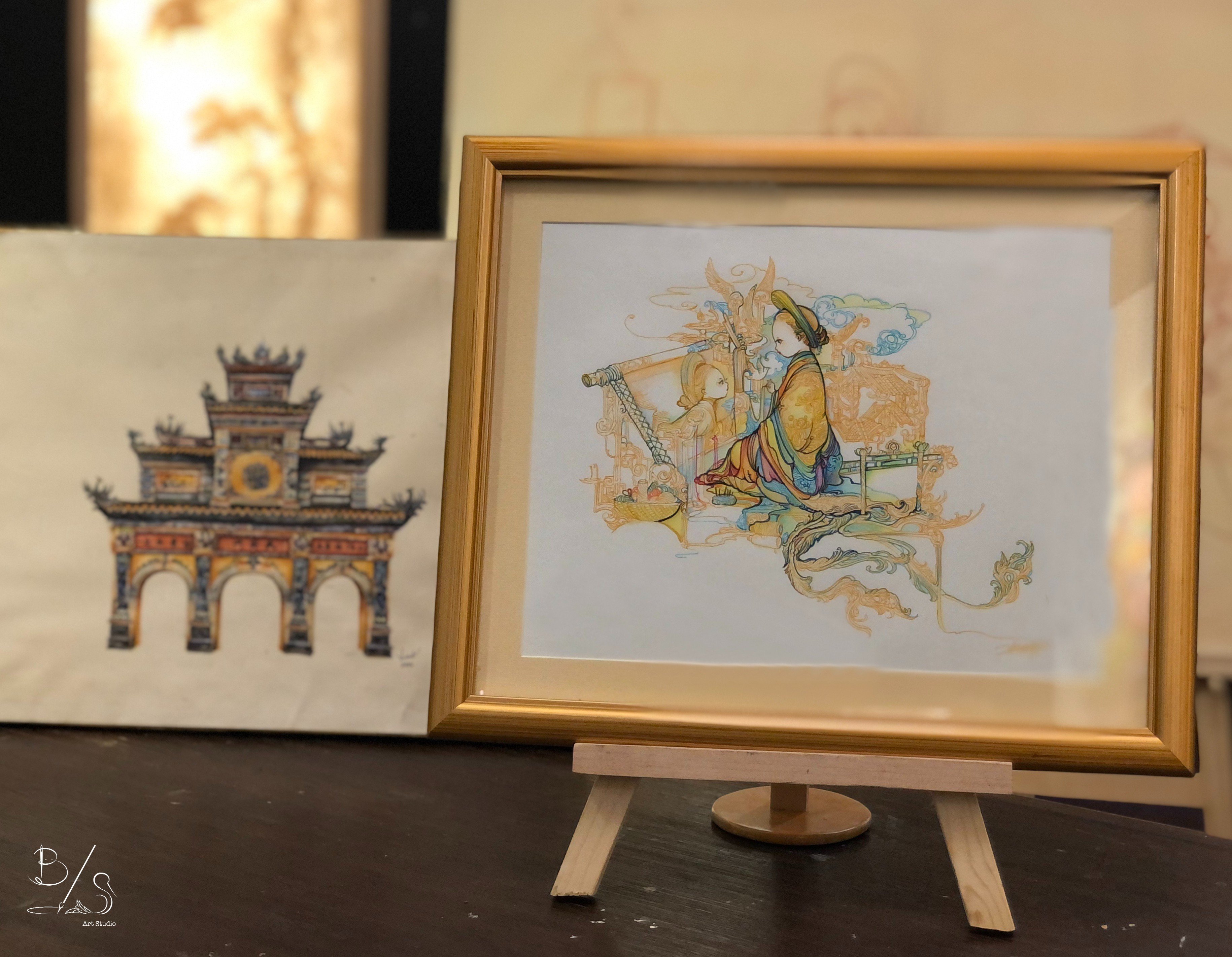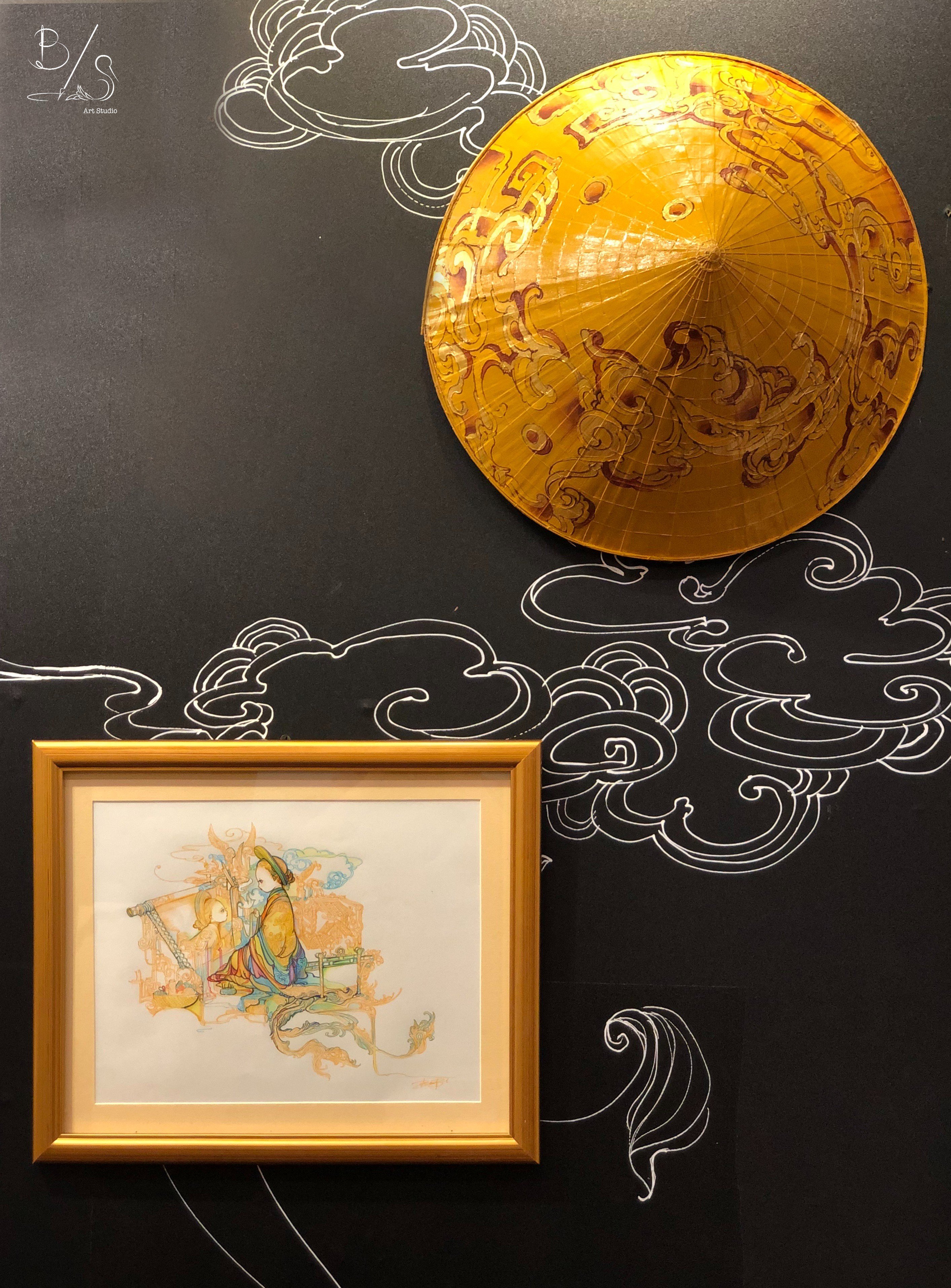 Tranh in nghệ thuật "Thêu Chân Dung, Họa Tâm Hồn" Với mong muốn truyền cảm hứng cho những bạn trẻ đam mê nghệ thuật và gìn giữ nét đặc sắc của văn hóa Việt, B/S Art Studio đã sáng tạo loạt tranh in nghệ thuật với chủ đề văn hóa Việt Tranh in được sử dụng công nghệ in chất lượng cao và in trên khổ giấy dày nên vẫn thể hiện được độ sắc xảo của từng chi tiết đồng thời màu in đậm rõ ràng không bị phai. B/S Art Studio mong những tác phẩm hội họa có thể giới thiệu và góp phần gìn giữ các ngành nghề thủ công truyền thống của dân tộc. Bộ sưu tập tranh in "Nghệ Nhân Việt" mượn hình ảnh các thiếu nữ mang ý nghĩa của sự khéo léo, tinh tế trong trang phục cách điệu dựa trên Áo Dài truyền thống, kết hợp nhiều hoa văn, họa tiết và biểu tượng đại diện cho những nghề thủ công truyền thống của Việt Nam.  Thông qua bộ tranh "Nghệ Nhân Việt" B/S Art Studio mong muốn giới thiệu những "Giá Trị Vượt Thời Gian" là kiến thức và kỹ thuật... sẽ được gìn giữ, bảo tồn và phát huy. Chính điều này sẽ là "sợi dây gắn kết" giúp chúng ta trò chuyện với Quá Khứ, hiểu được các giá trị của Hiện Tại và hướng đến Tương Lai. Dù là Tranh in nhưng trên mỗi tác phẩm sẽ được họa sĩ B/S ký tên và dùng bút 3D vẽ thêm, tạo hiệu ứng nổi, giúp phản quan ở nhiều góc độ và làm tranh thêm nổi bật, trang nhã và sang trọng. Tác phẩm " Thêu Chân Dung, Họa Tâm Hồn" mô tả nàng tiểu thư (trong bộ trang phục Nhật Bình truyền thống của Việt Nam) dùng sắc màu của sợi chỉ để họa tâm tư, giấc mơ của mình. Nàng muốn thoát khỏi những luật lệ, những ràng buộc trong khuôn khổ quy tắc nơi chốn kinh thành xưa để tìm đến sự tự do.