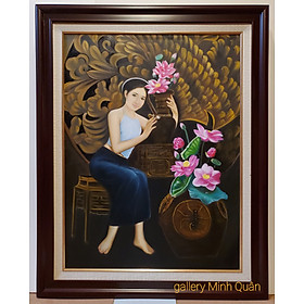Tranh vẽ sơn dầu- Thiếu nữ bên bình sen Chất liệu: Sơn dầu vẽ trên vải toan. Khung tranh màu nâu vân gỗ composite cao cấp bền đẹp. Kích thước 77*97cm