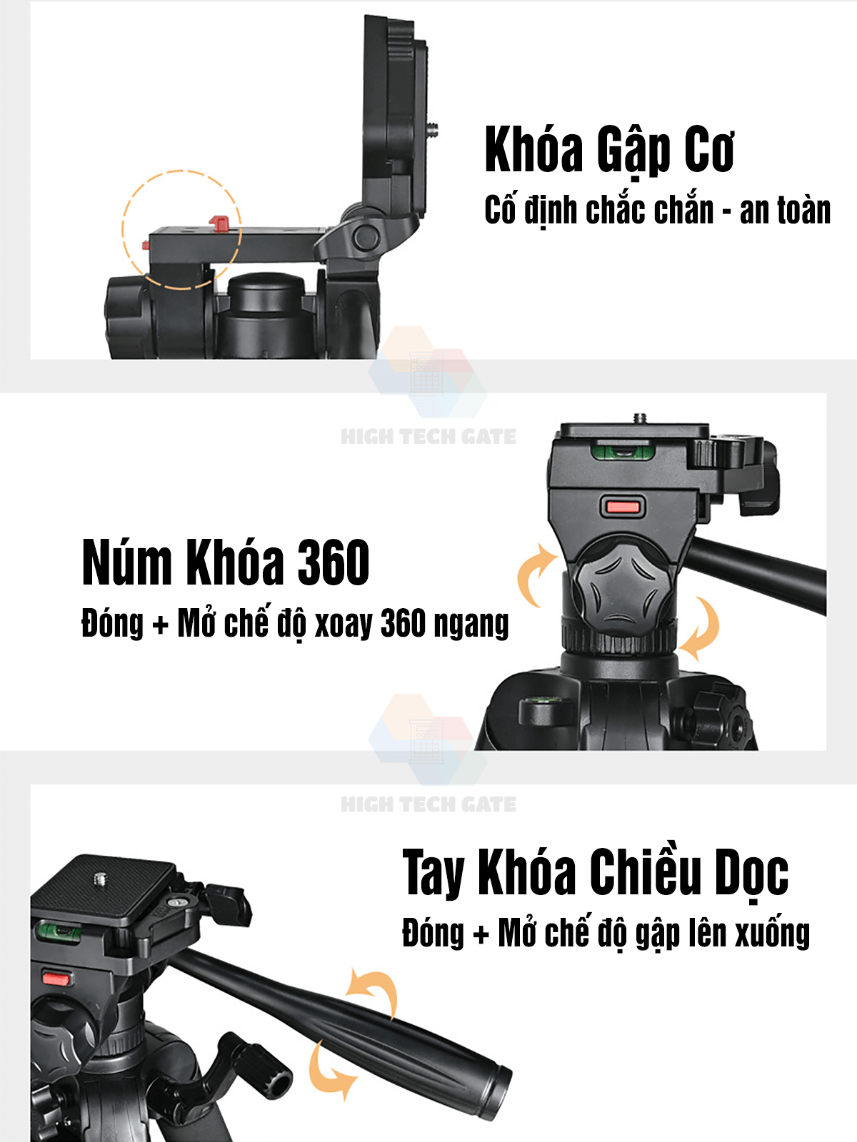 1. Tripod VCT 5208RM Chiều cao tối đa: 1250 mm Chiều cao khi thu gọn: 430 mm Trọng lượng: 0.7 kg Khả năng chịu lực: 1.5 kg Chất liệu: Hợp kim nhôm sơn tĩnh điện,