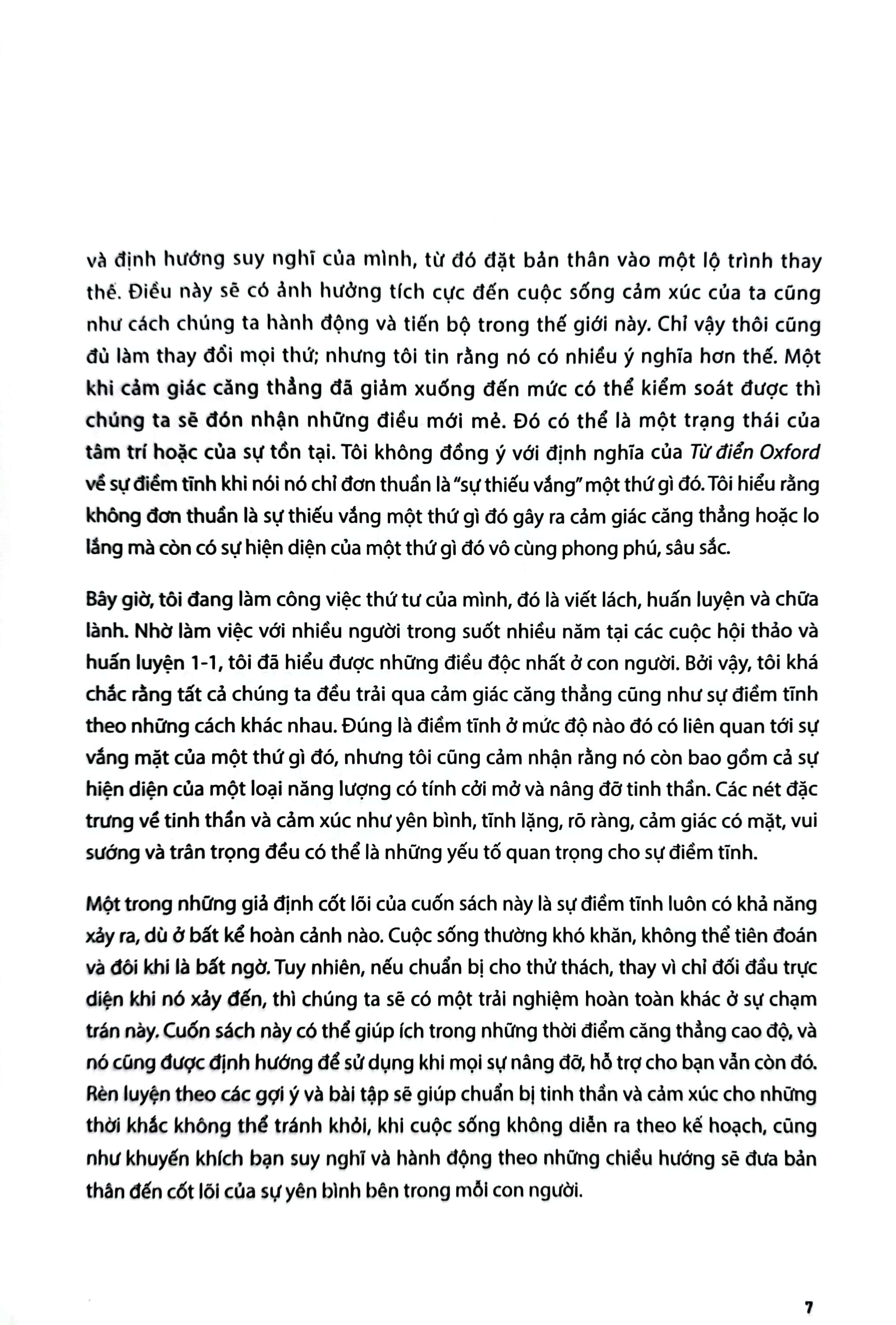 Nguyên tắc cơ bản của cuốn sách này là sẽ là sai lầm nếu coi căng thẳng là điều không thể tránh được: lo lắng không phải là một phần của bản thân, nó là một phản hồi, và giống như tất cả các phản hồi khác, nó nằm trong khả năng kiểm soát của mỗi người. Chúng ta có thể chọn trở nên điềm tĩnh.