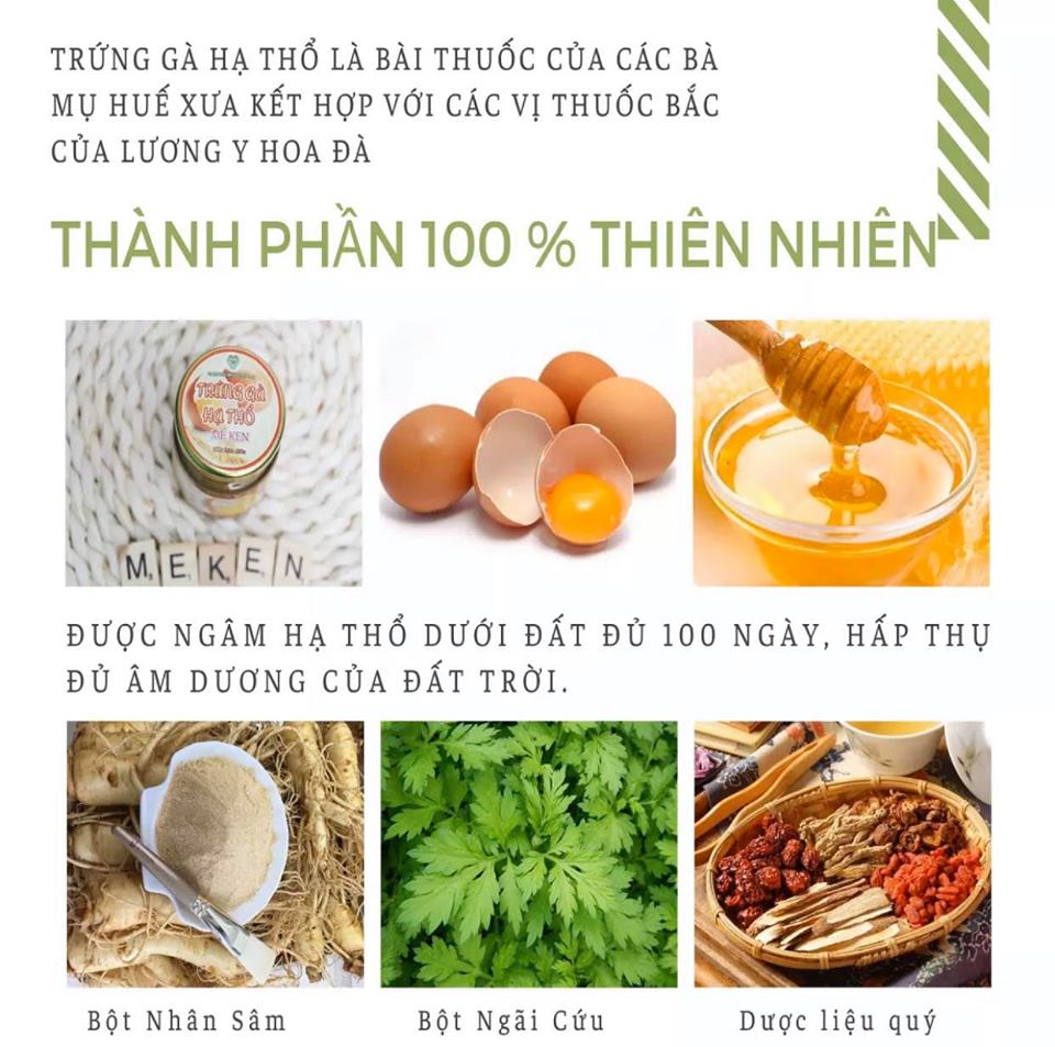 TRỨNG GÀ HẠ THỔ MẸ KEN Dùng cho khách muốn hỗ trợ điều trị nám, tàn nhang, ngừa mụn, trắng và hồng mịn da. Thành phần : + Chỉ gồm trứng ( hoàn toàn là