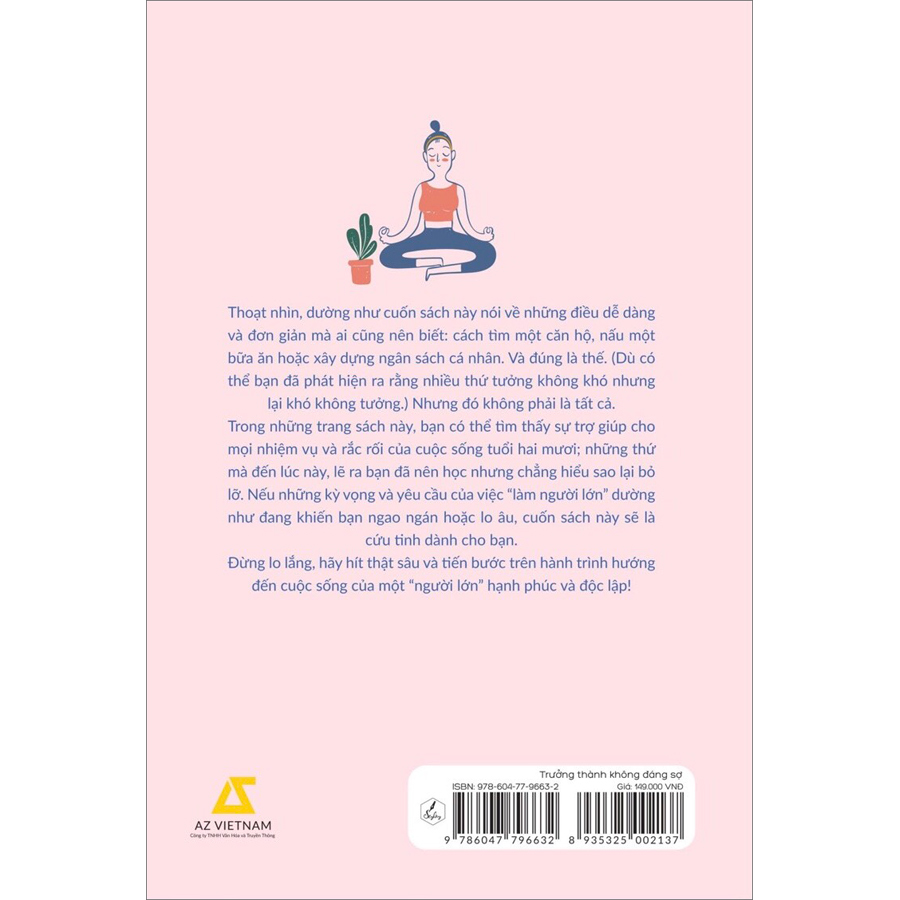 Đối với những người trẻ đang tự hỏi: “Tôi đã 25 tuổi, tại sao tôi không biết nấu ăn, quản lý tài chính hoặc kết bạn?”, hãy cầm lấy cuốn sách này. Trong những trang sách bạn chuẩn bị đọc, bạn có thể tìm thấy sự trợ giúp cho mọi nhiệm vụ và rắc rối của cuộc sống tuổi hai mươi, những thứ mà đến lúc này, lẽ ra bạn đã nên biết nhưng chẳng hiểu sao lại bỏ lỡ. Dù chủ đề được bàn đến là các mối quan hệ, nhà ở, chăm sóc bản thân, tài chính hay thị trường việc làm, “Trưởng thành không đáng sợ” đều đưa ra những mẹo vặt, chia sẻ từ người đi trước vô cùng thiết thực và dễ dàng thực hiện. Nếu những kỳ vọng và yêu cầu của việc “làm người lớn”dường như đang khiến bạn ngao ngán và lo âu, cuốn sách này sẽ là cứu tinh cho bạn.
