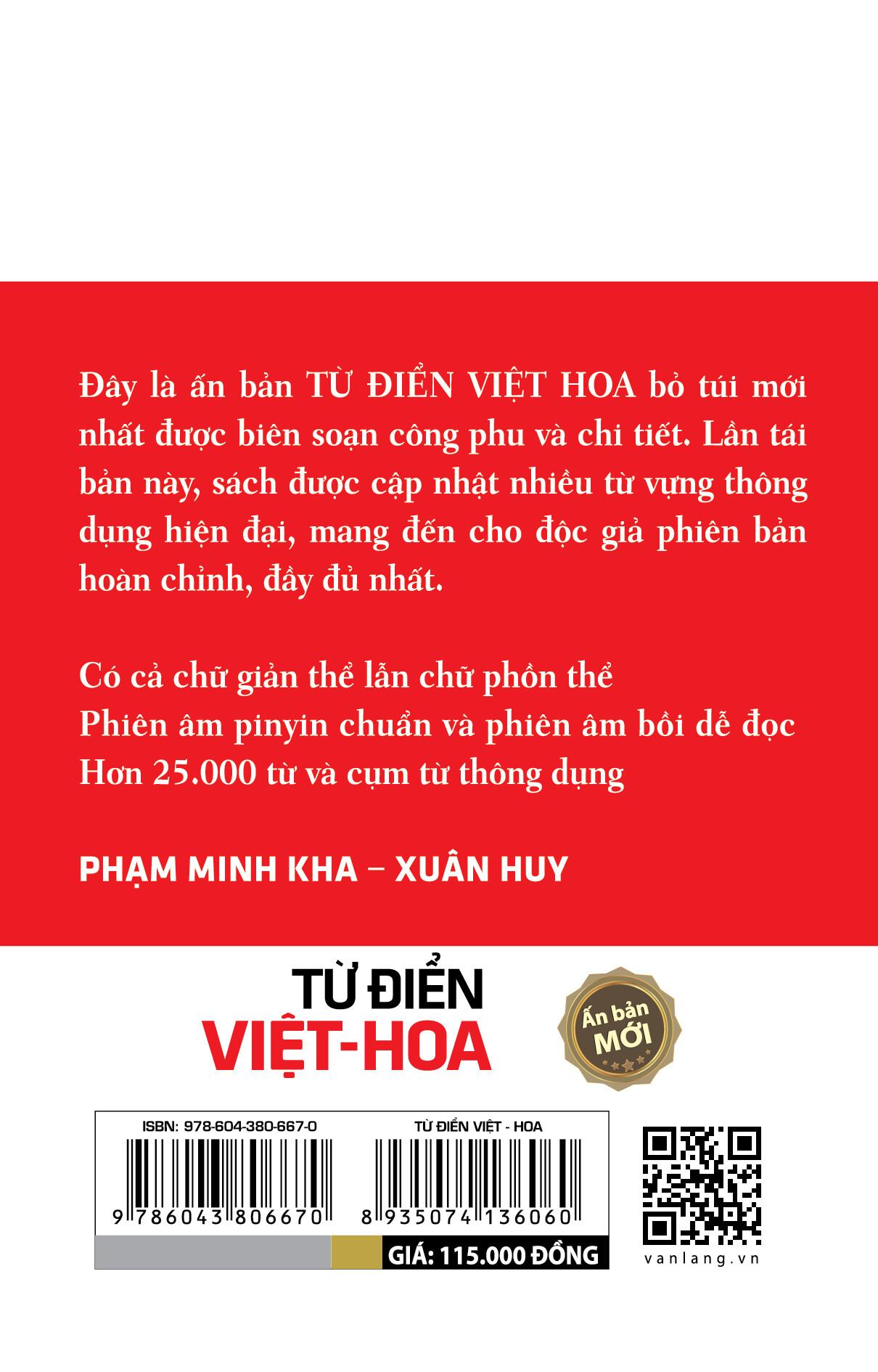 "Đây là ấn bản Từ điển Việt Hoa bỏ túi mới nhất được biên soạn công phu và chi tiết. Lần tái bản này, sách được cập nhật nhiều từ vựng thông dụng hiện đại,