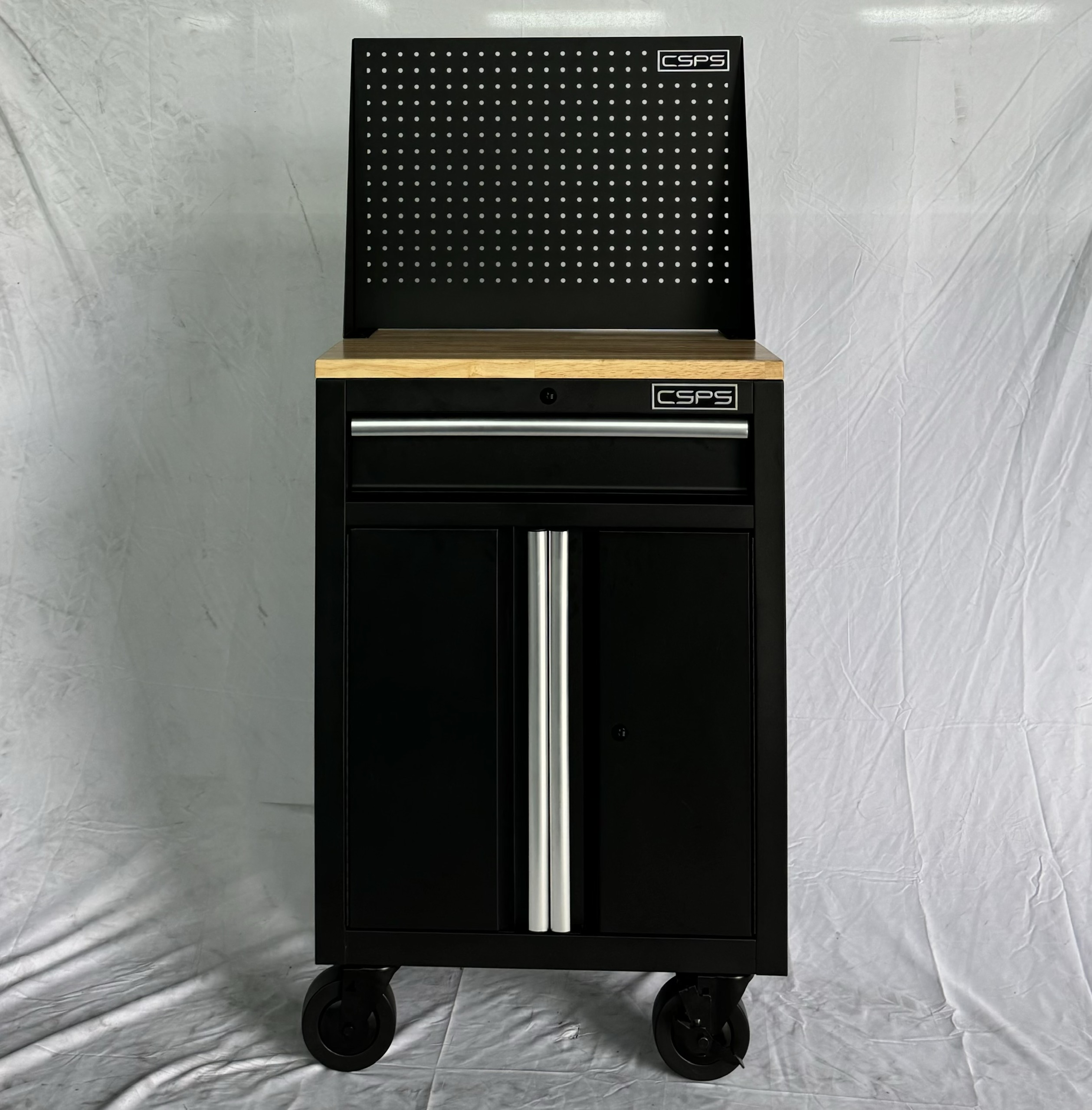 Tủ dụng cụ CSPS 61cm - 01 hộc kéo màu đen bánh xe ván gỗ vách lưới (tay cầm trắng)