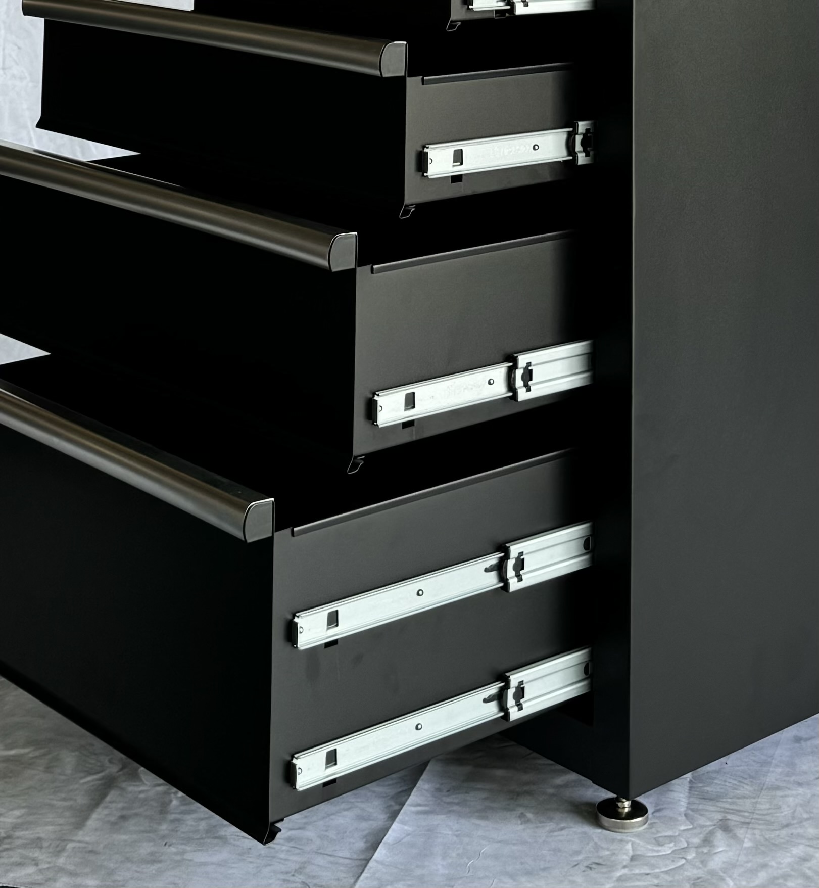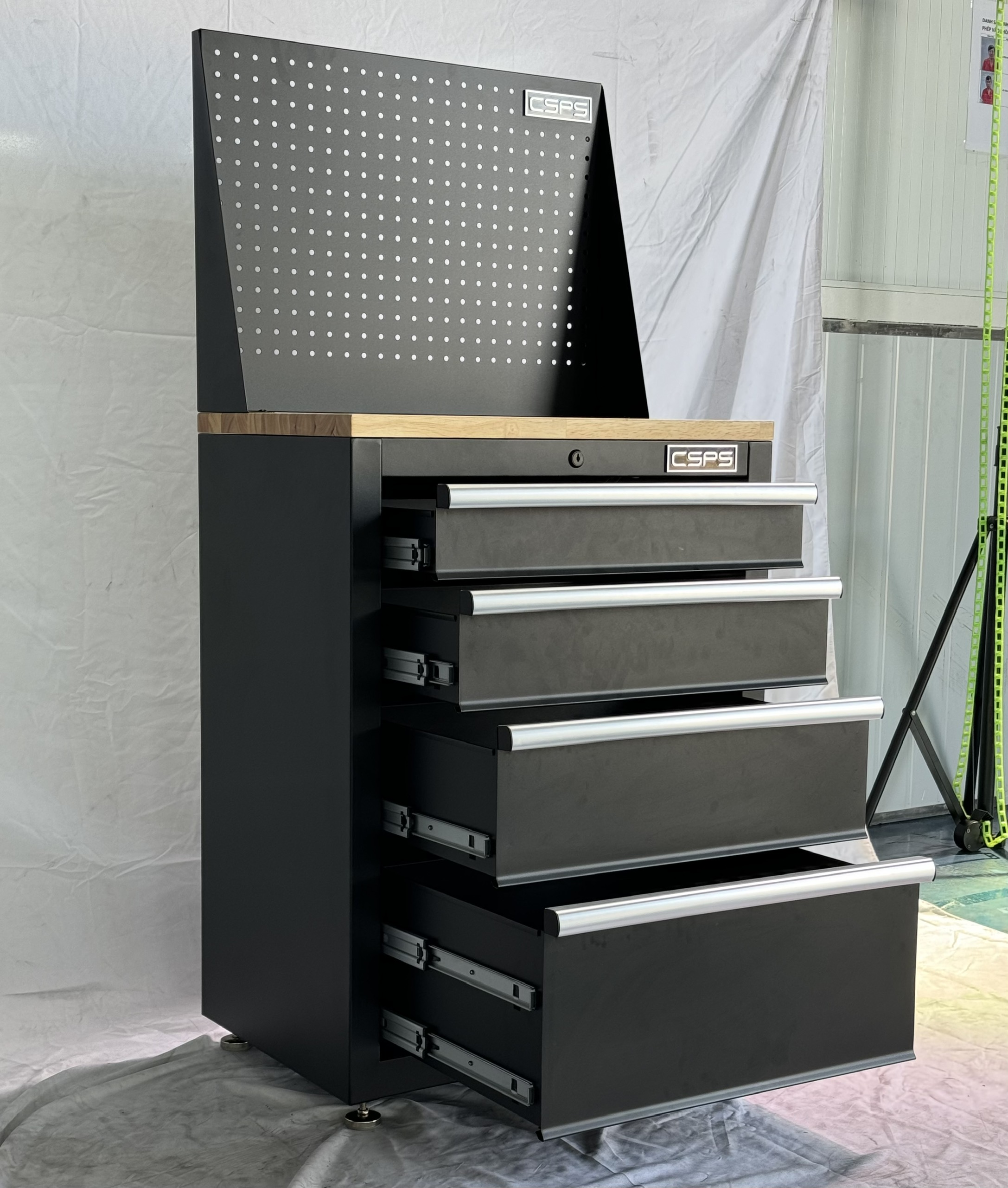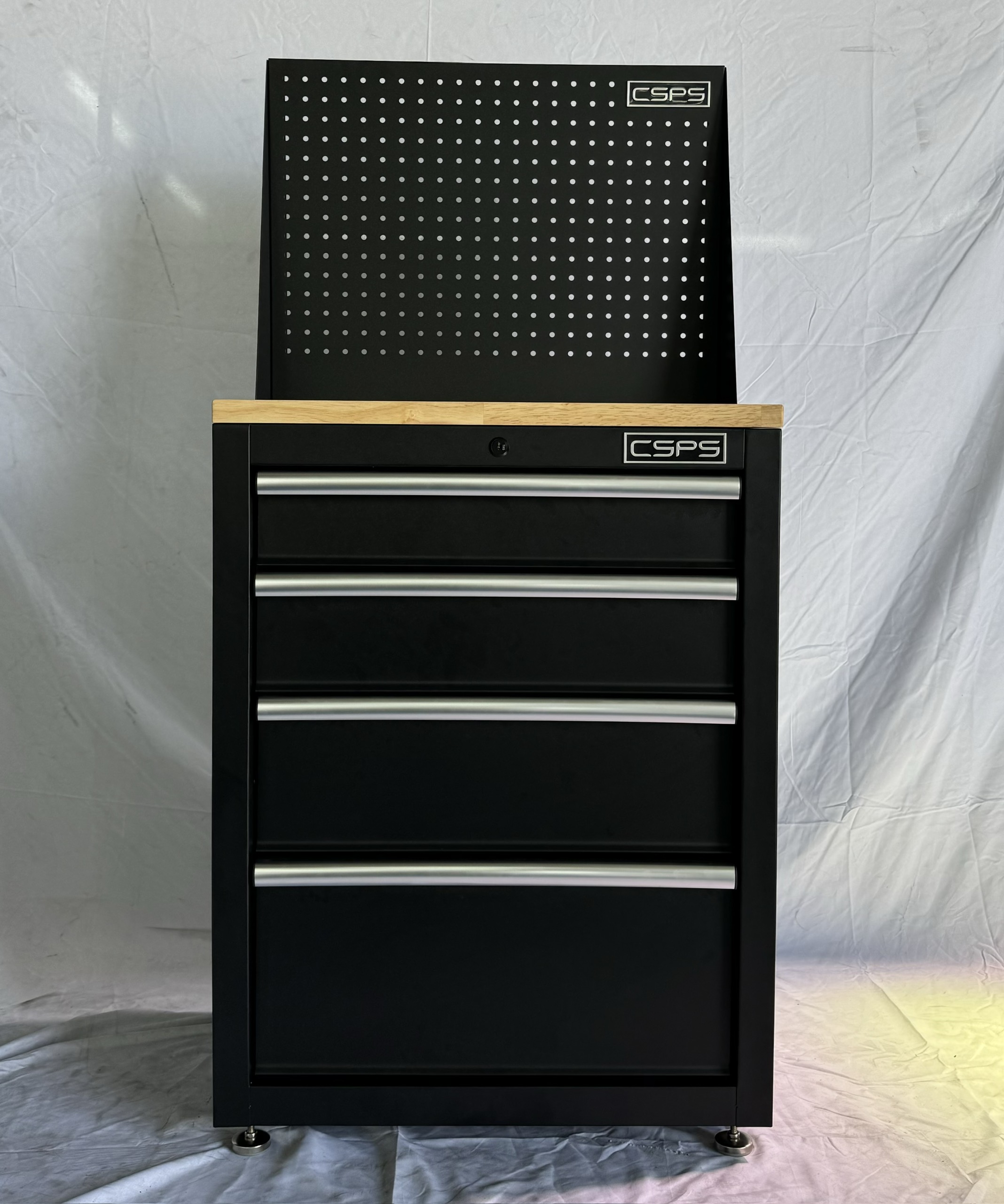 • Tủ dụng cụ CSPS 61cm - 04 hộc kéo màu đen chân tăng chỉnh ván gỗ vách lưới (tay cầm trắng)