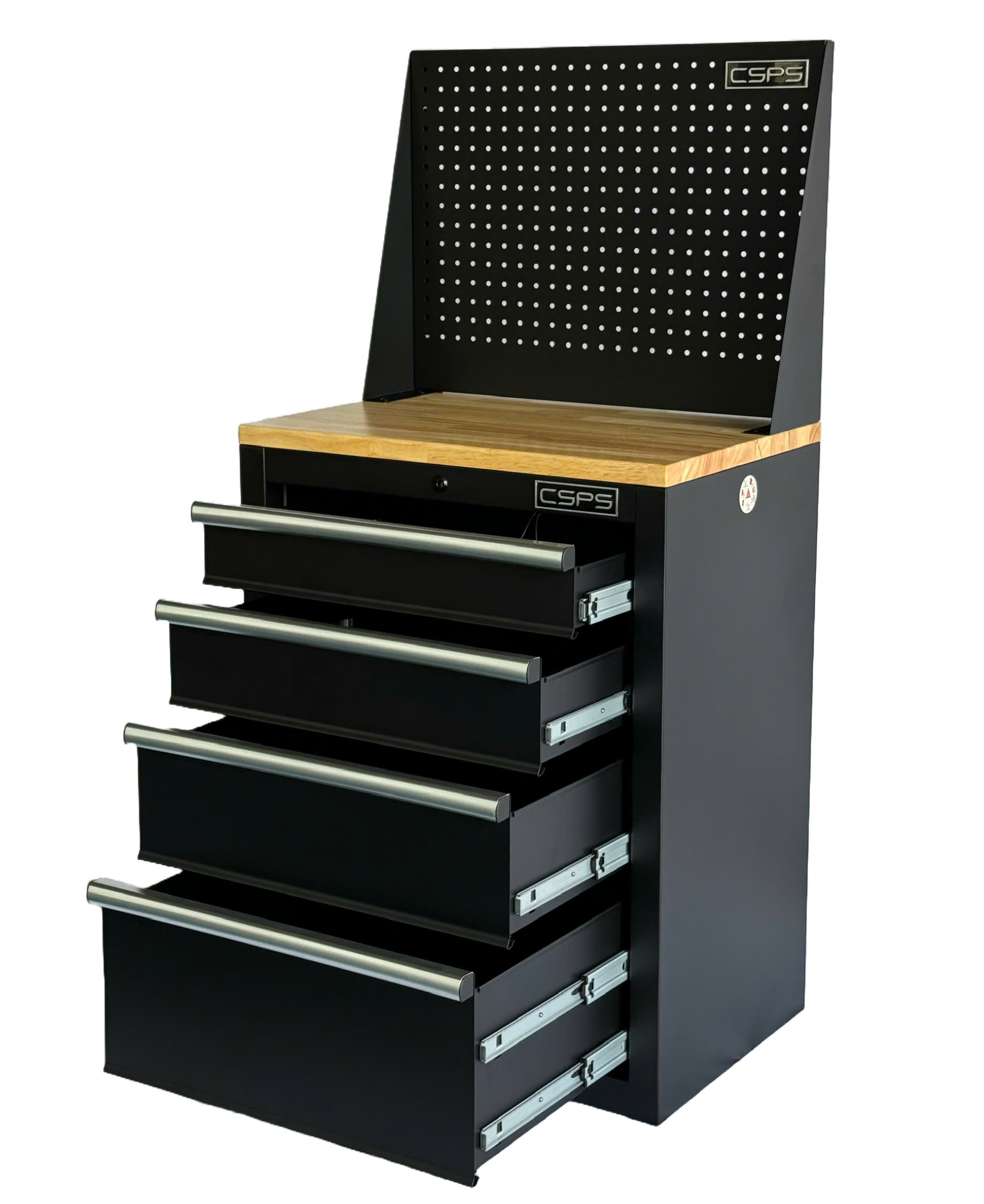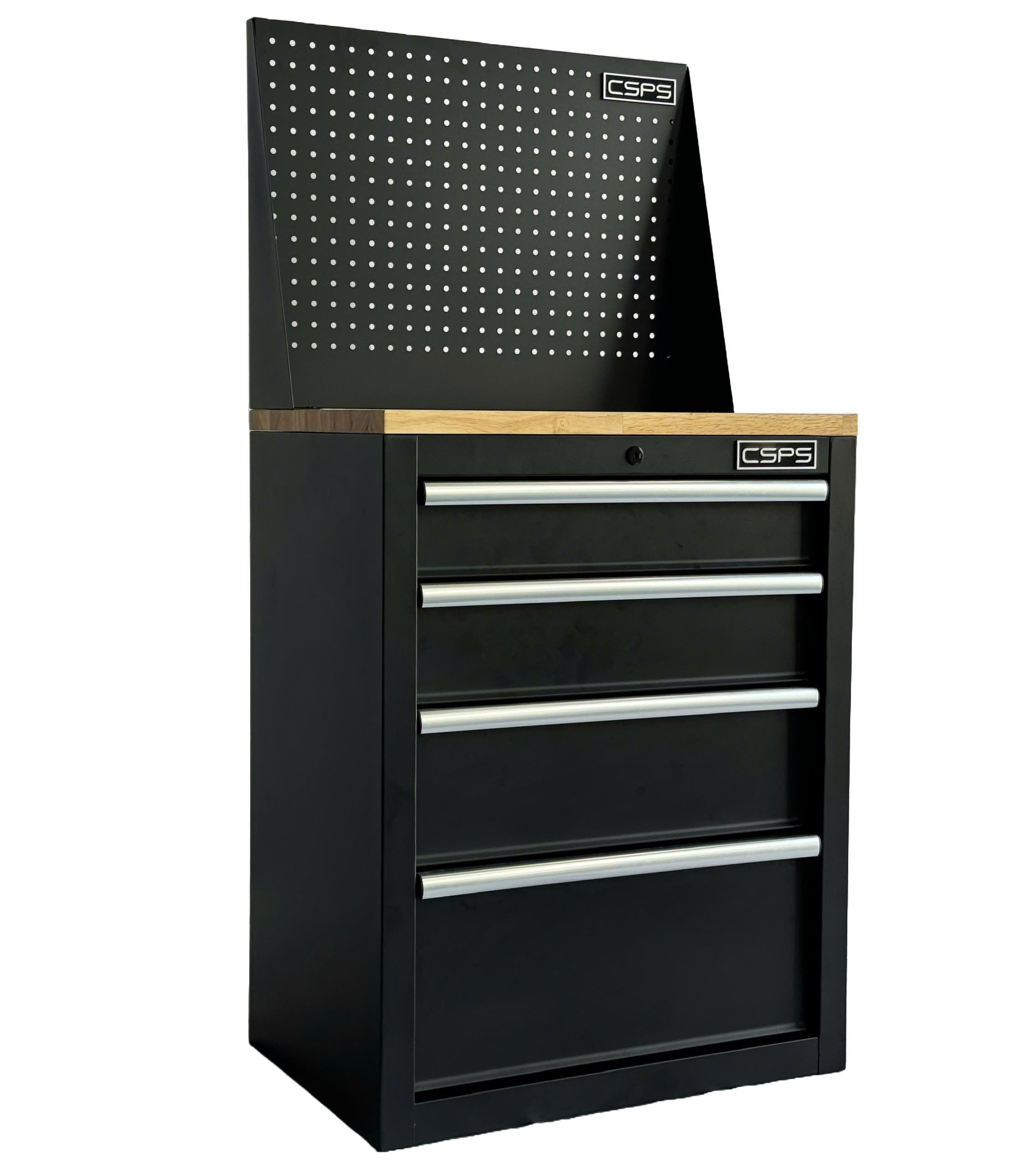 Tủ dụng cụ CSPS 61cm - 04 hộc kéo màu đen ván gỗ vách lưới (tay cầm đen) 1.THÔNG SỐ CHUNG Kích thước đóng gói/ Package dimension: 62cm W x 43cm D x 78.5cm H