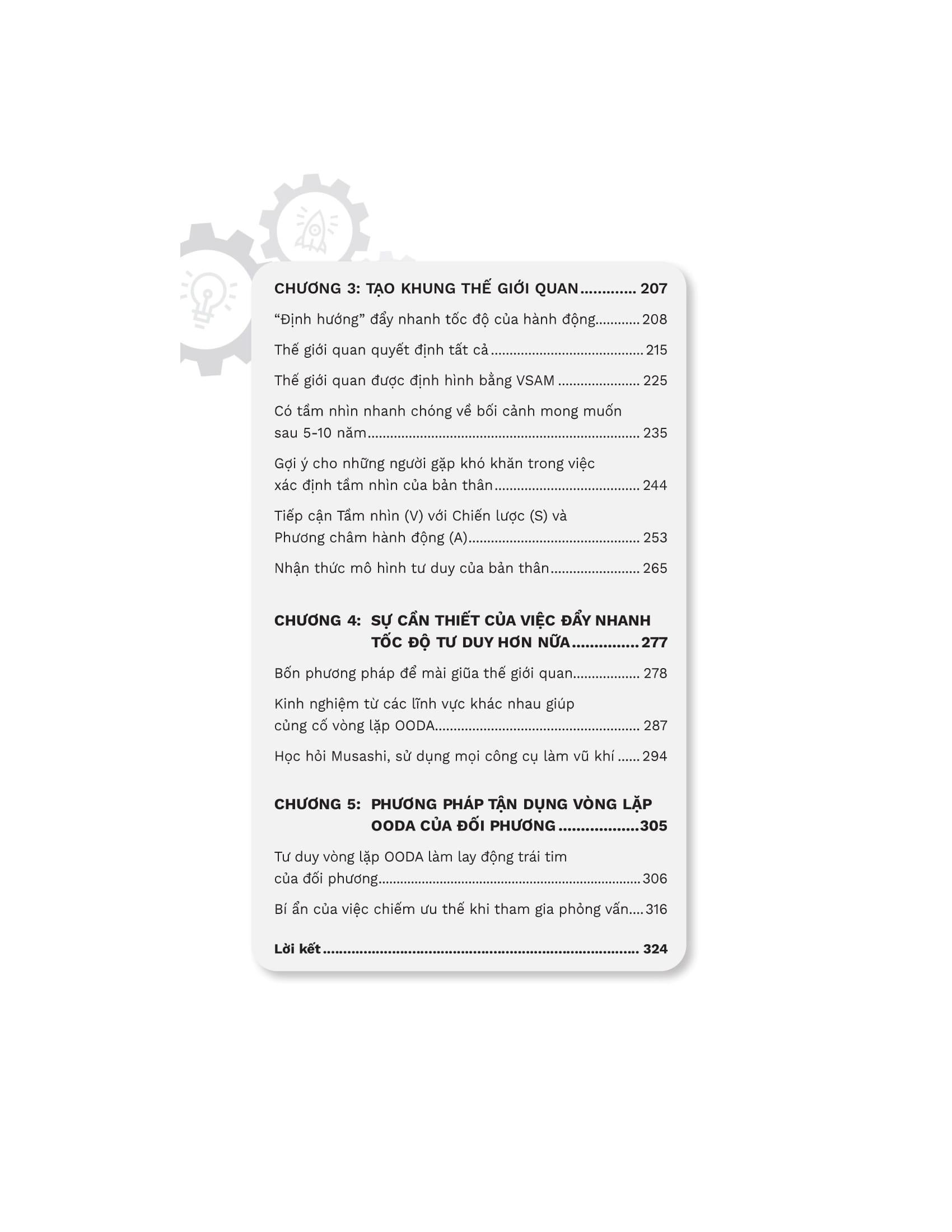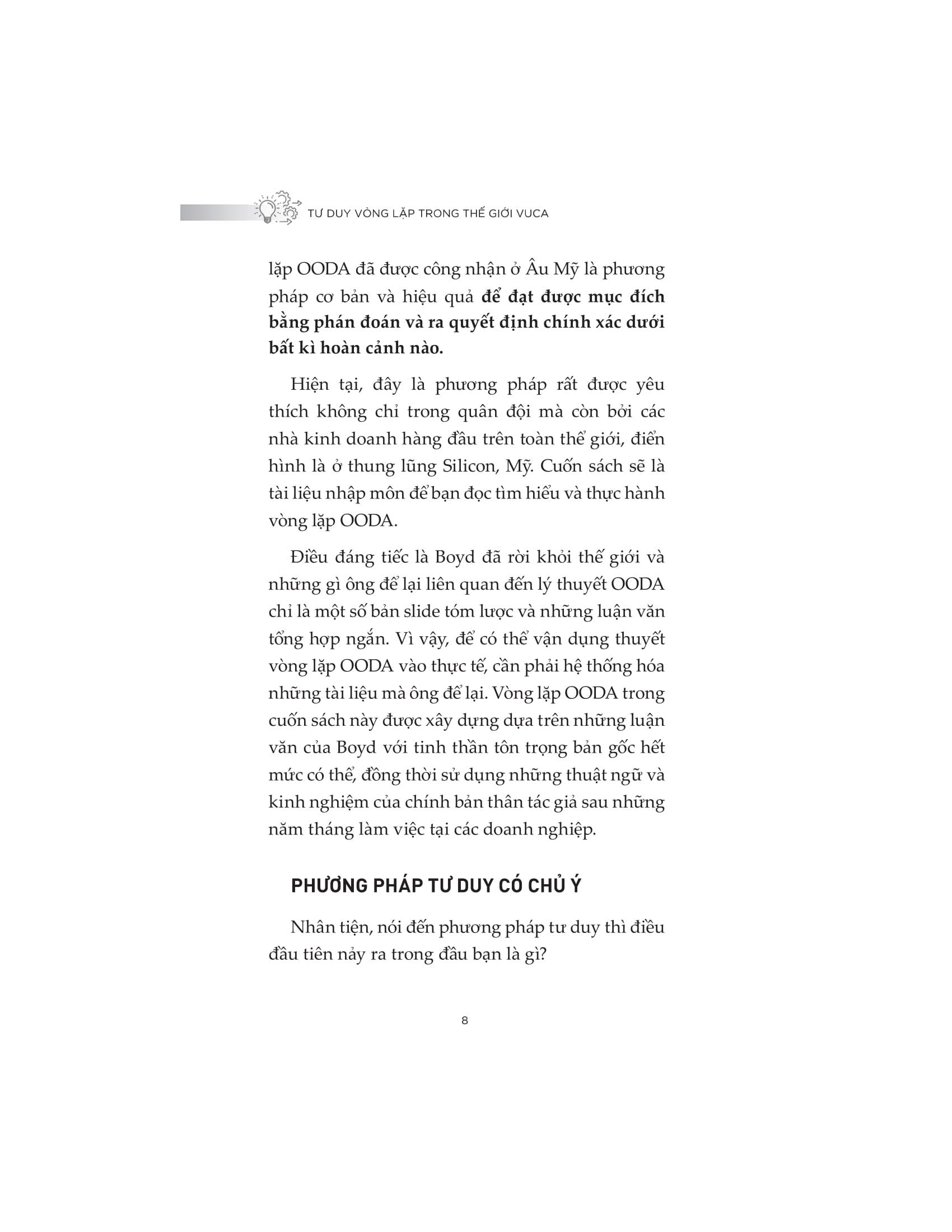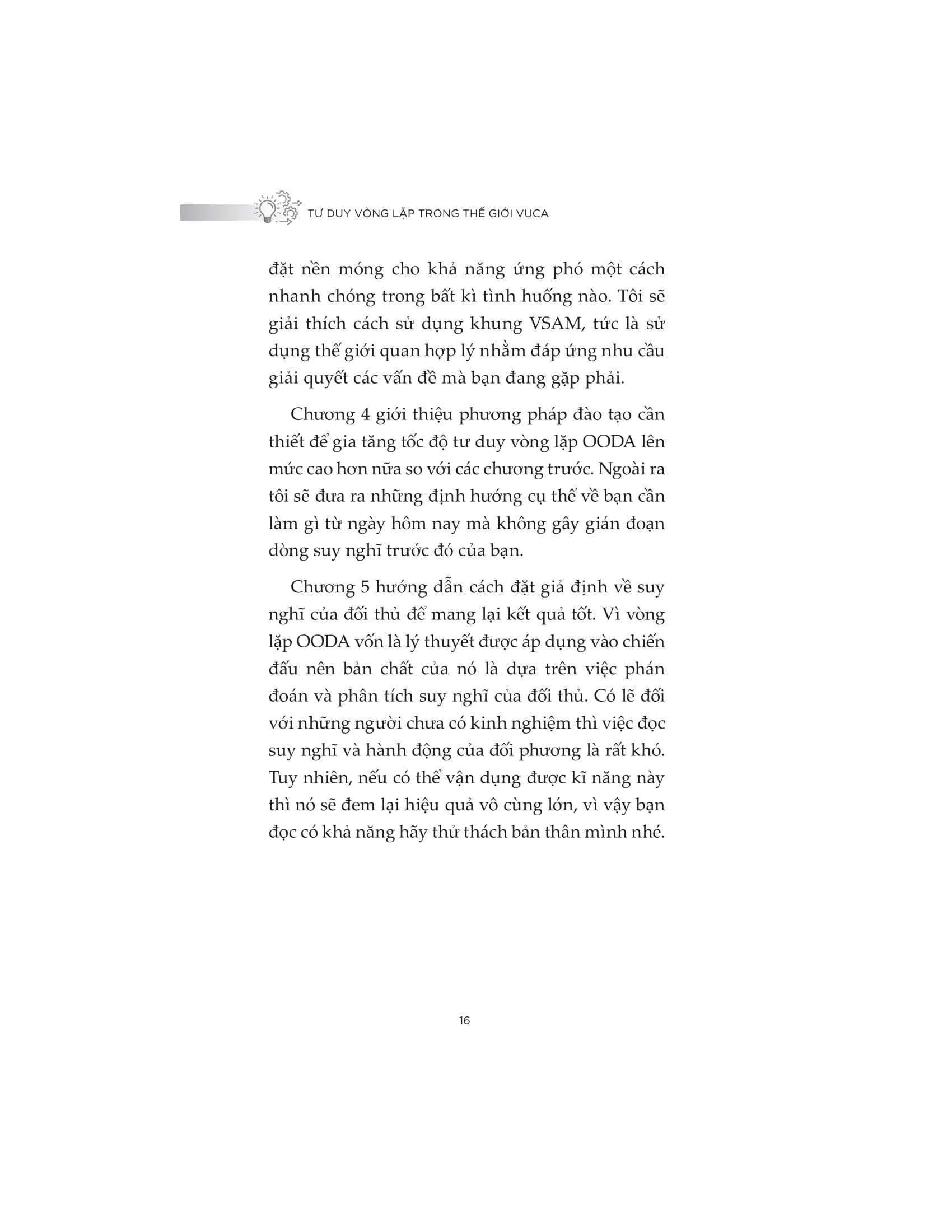 Cuốn sách “Tư duy vòng lặp trong thế giới VUCA” hướng dẫn các “lối tắt” giúp ứng dụng vòng lặp OODA vào các tình huống thực tiễn một cách linh hoạt và hiệu quả, nó chắc chắn mang lại lợi ích đủ lớn để bạn từ bỏ lối tư duy thông thường của m.ình sang một lối tư duy "thần tốc" hơn. Thông qua những câu chuyện thực tế đi kèm nhiều ví dụ minh họa, bạn sẽ hiểu rõ việc áp dụng tư duy vòng lặp OODA vào bối cảnh công việc để đánh giá tình huống, nhìn nhận vấn đề, ra quyết định và hành động nhanh chóng.
