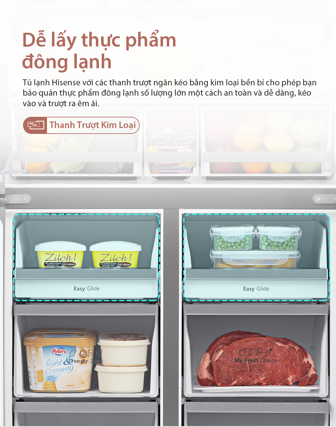- Thanh Trượt Kim Loại: Tủ lạnh Hisense với các thanh trượt ngăn kéo bằng kim loại bền bỉ cho phép bạn bảo quản thực phẩm đông lạnh số lượng lớn một cách an toàn và dễ dàng, kéo vào và trượt ra êm ái.