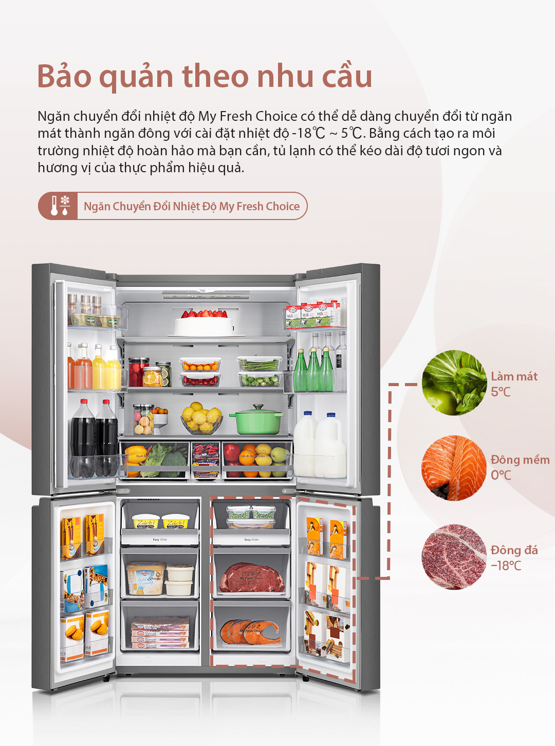 - Ngăn Chuyển Đổi Nhiệt Độ My Fresh Choice: Ngăn chuyển đổi nhiệt độ My Fresh Choice có thể dễ dàng chuyển đổi từ ngăn mát thành ngăn đông với cài đặt nhiệt độ -18℃ ~ 5℃. Bằng cách tạo ra môi trường nhiệt độ hoàn hảo mà bạn cần, tủ lạnh có thể kéo dài độ tươi ngon và hương vị của thực phẩm hiệu quả.
