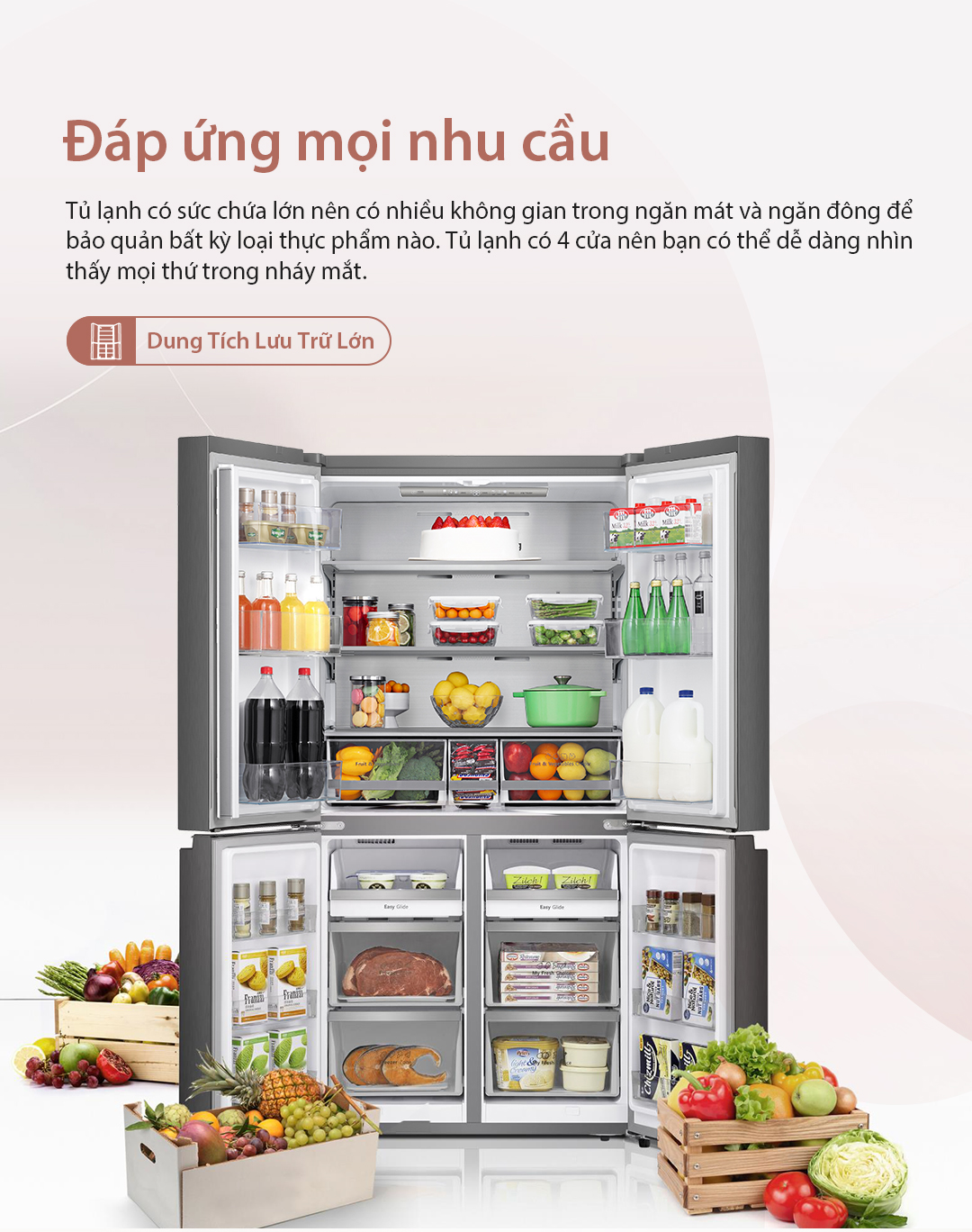 - Dung Tích Lưu Trữ Lớn: Tủ lạnh có sức chứa lớn nên có nhiều không gian trong ngăn mát và ngăn đông để bảo quản bất kỳ loại thực phẩm nào. Tủ lạnh có 4 cửa nên bạn có thể dễ dàng nhìn thấy mọi thứ trong nháy mắt.