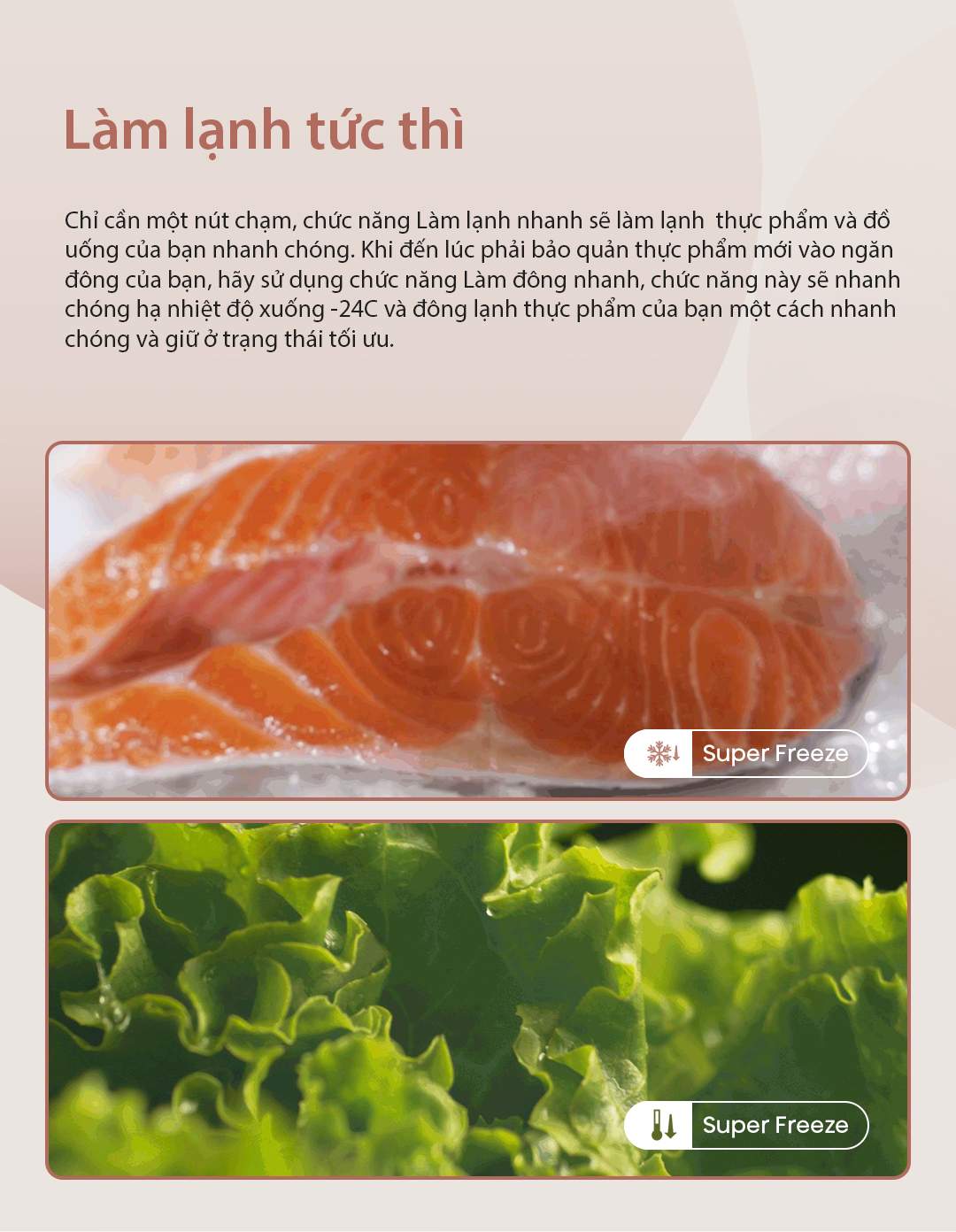 - Làm Lạnh Nhanh Super Cool & Super Freeze: Chỉ cần một nút chạm, chức năng Làm lạnh nhanh sẽ làm lạnh thực phẩm và đồ uống của bạn nhanh chóng. Khi đến lúc phải bảo quản thực phẩm mới vào ngăn đông của bạn, hãy sử dụng chức năng Làm đông nhanh, chức năng này sẽ nhanh chóng hạ nhiệt độ xuống -24C và đông lạnh thực phẩm của bạn một cách nhanh chóng và giữ ở trạng thái tối ưu.